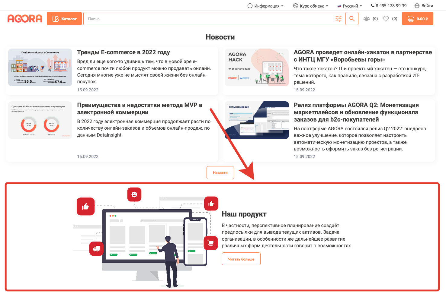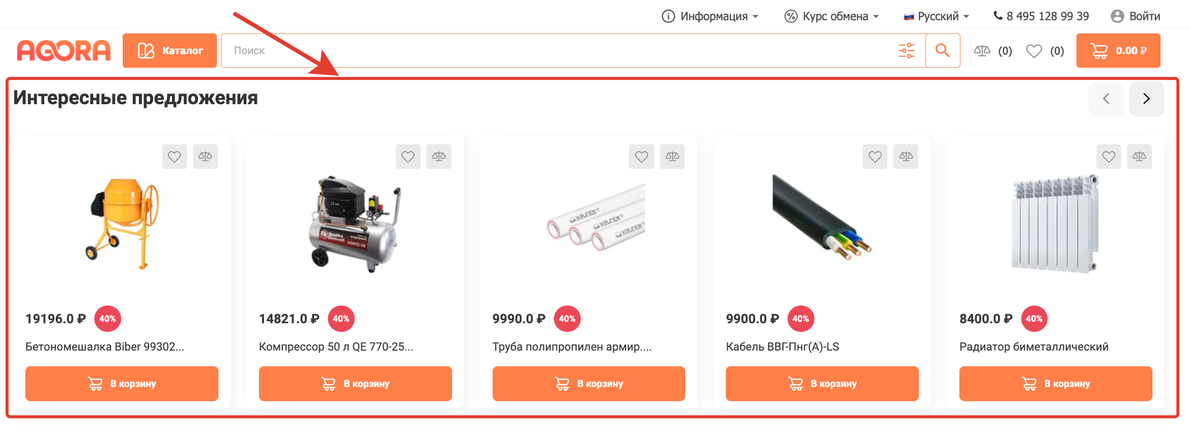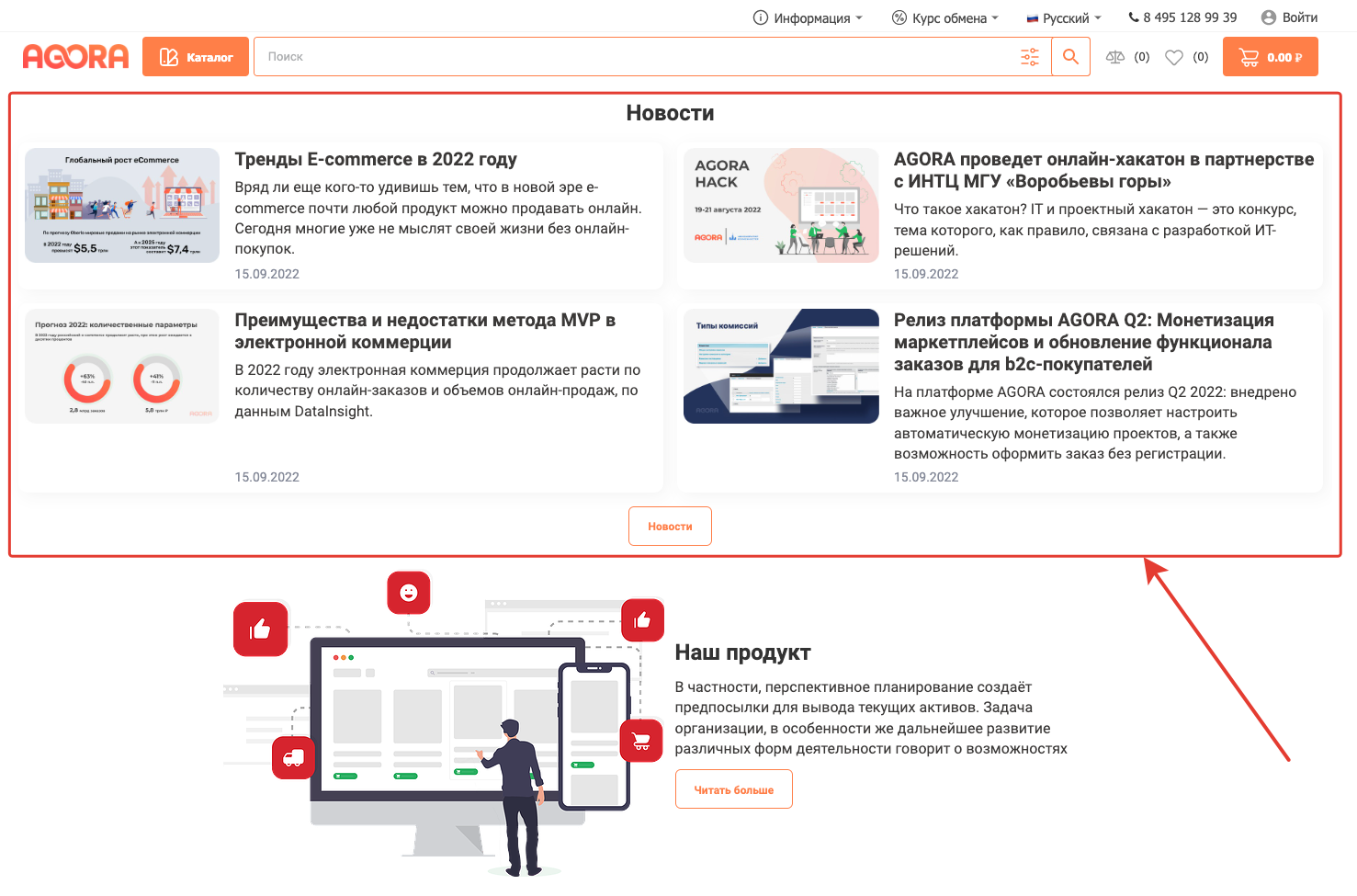 Ниже хедера отображаются блоки главной страницы. Настройка выполняется через панель администратора в разделе Блоки конструктора страницы.
