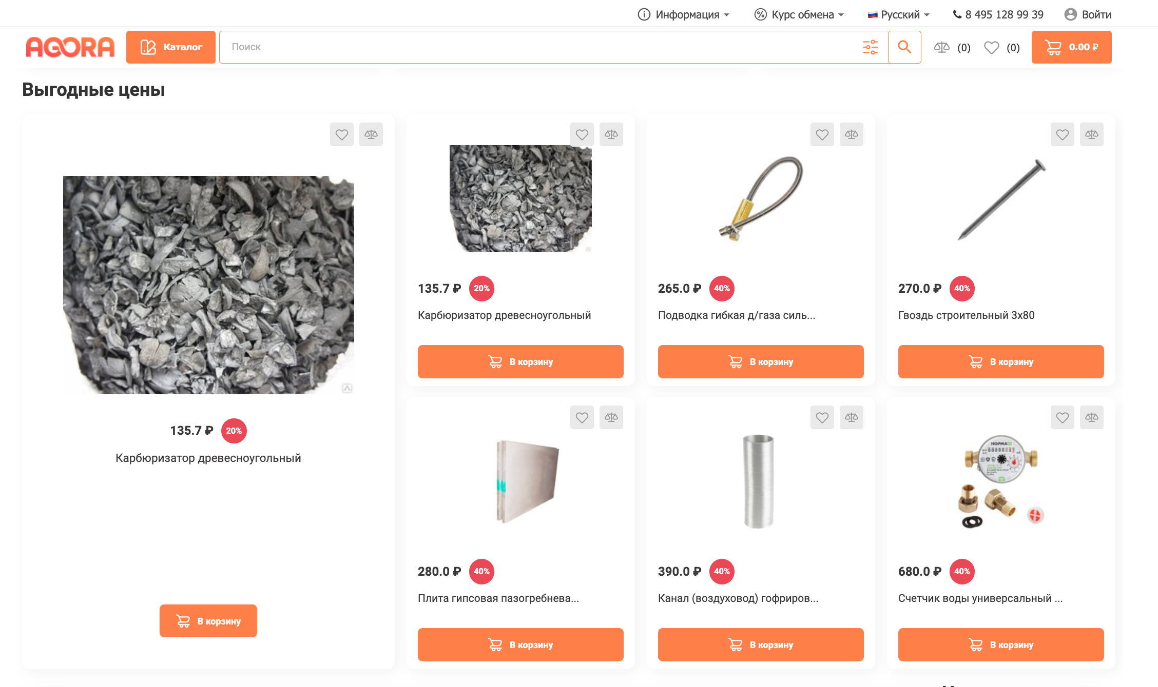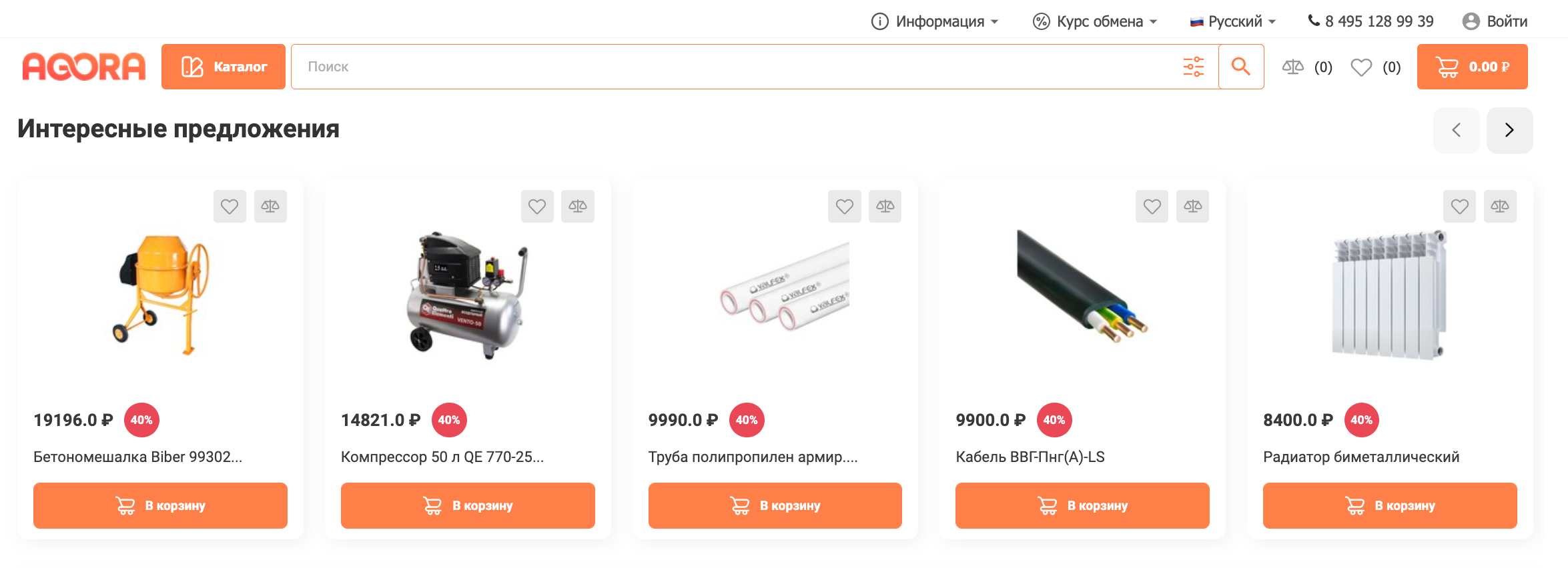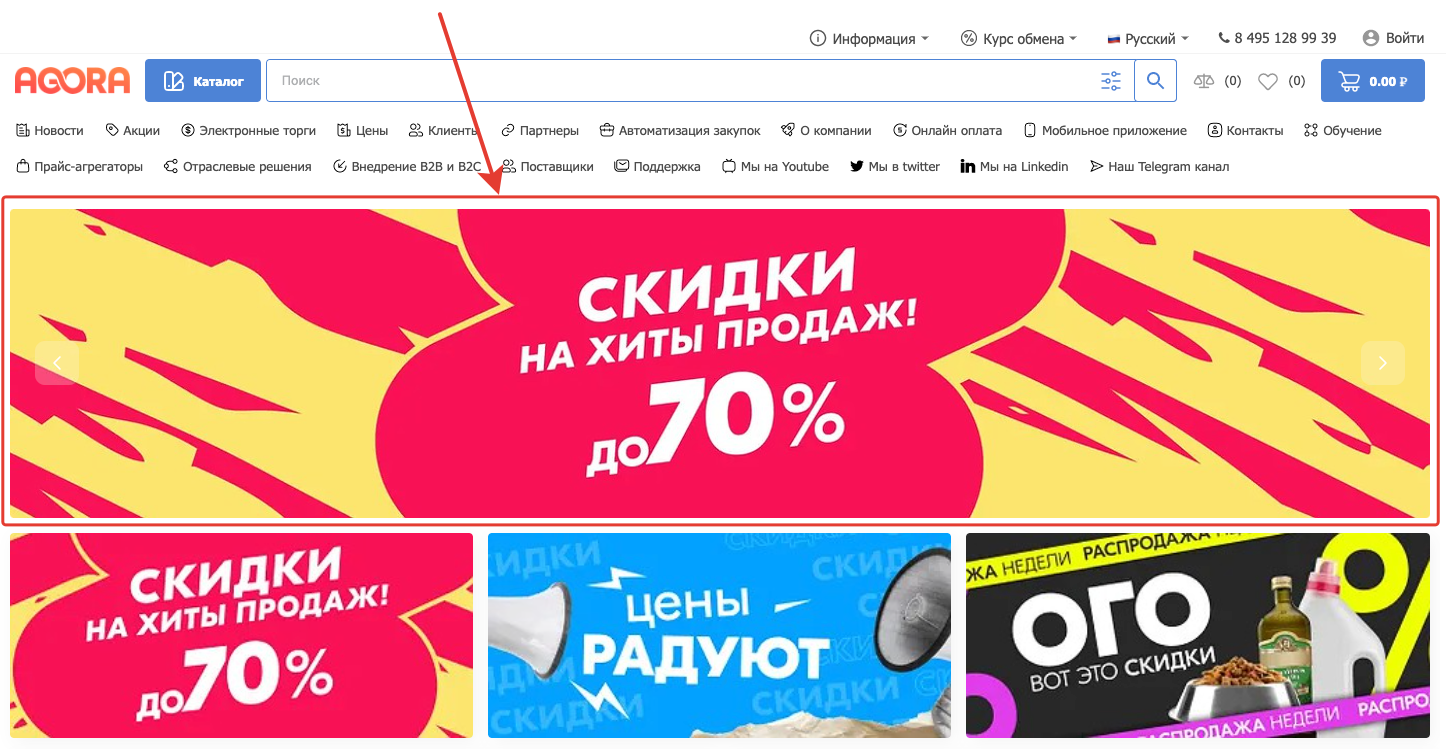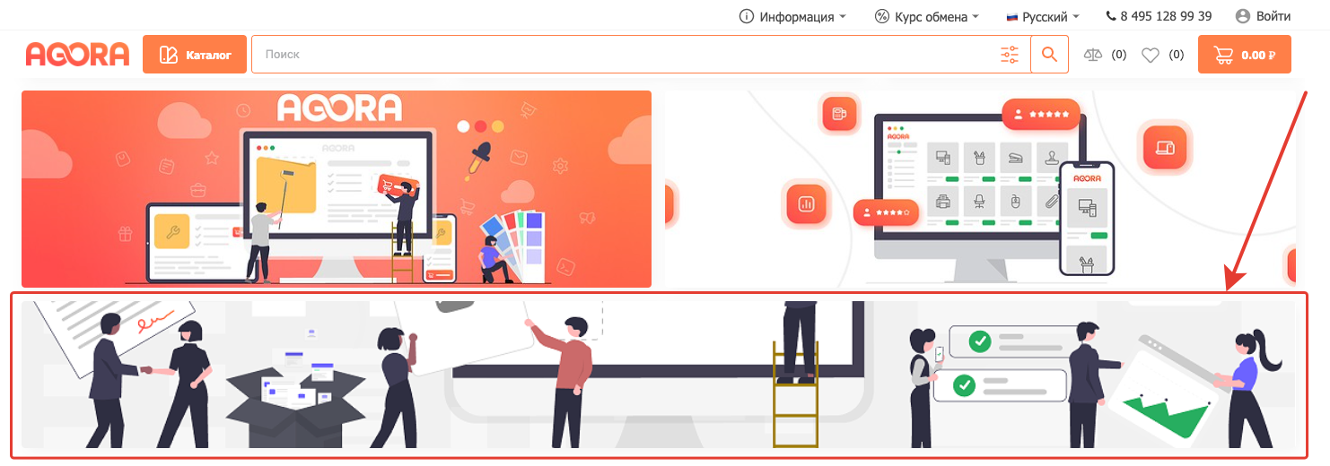 Ниже хедера отображаются блоки главной страницы. Настройка выполняется через панель администратора в разделе Блоки конструктора страницы.