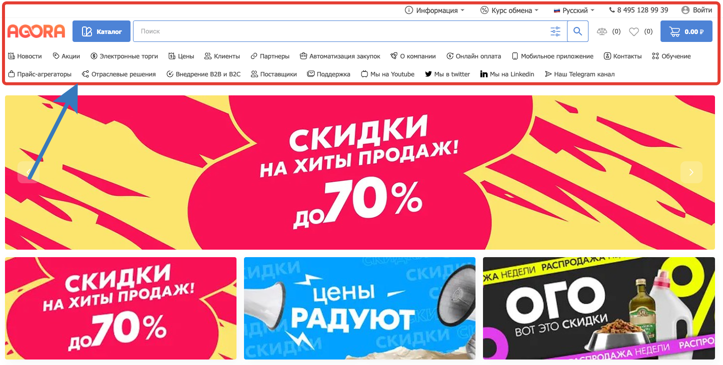 Кроме того, сверху может также выводится блок информации, курс обмена валюты, свитчер переключения языков, контактный номер телефона и кнопка входа в личный кабинет.