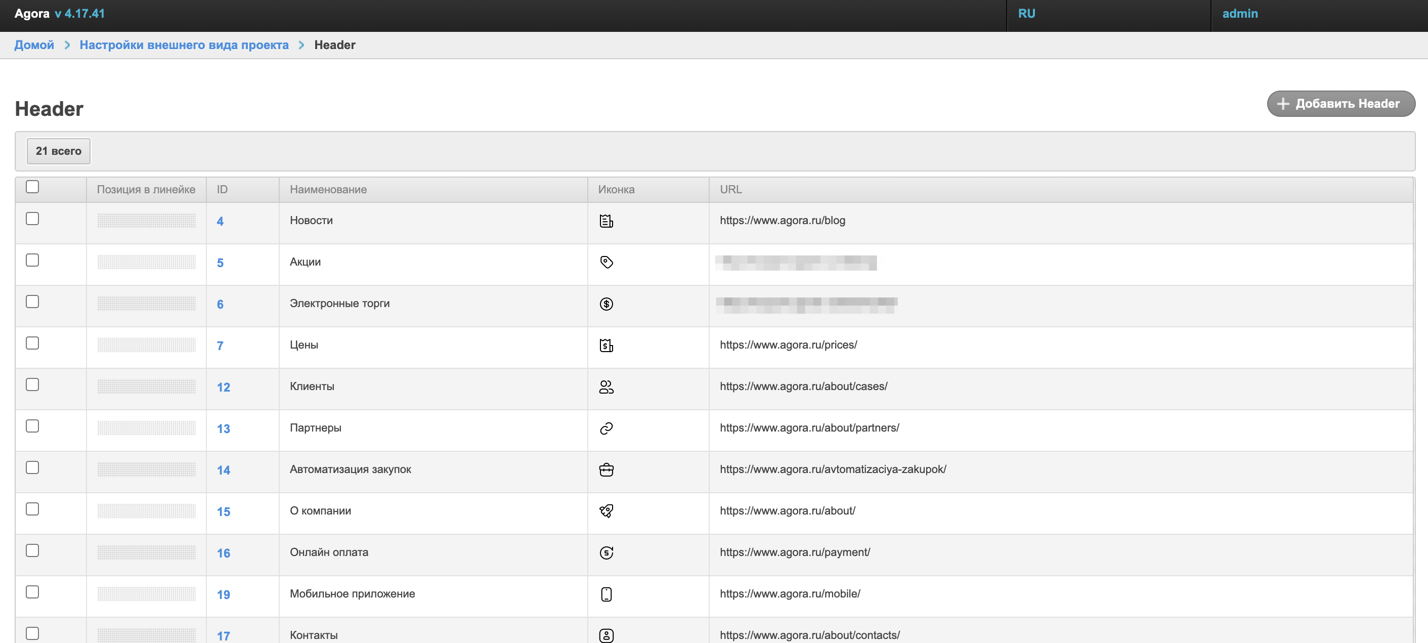 Для добавления нового раздела в хедер необходимо нажать кнопку Добавить Header в правом верхнем углу страницы.