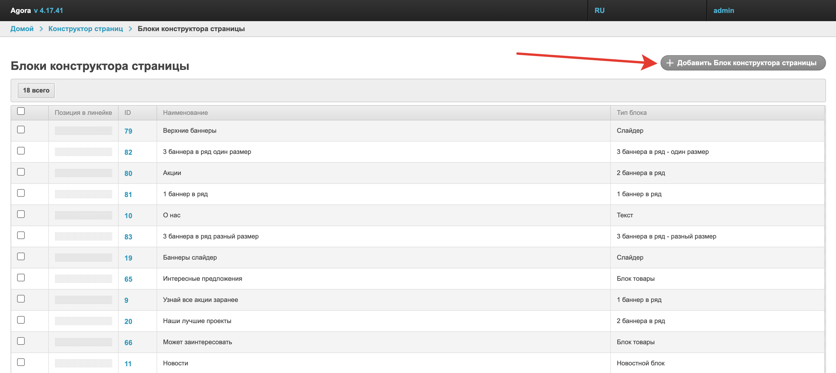 Для добавления нового раздела в хедер необходимо нажать кнопку Добавить Блок конструктора страницы в правом верхнем углу страницы.