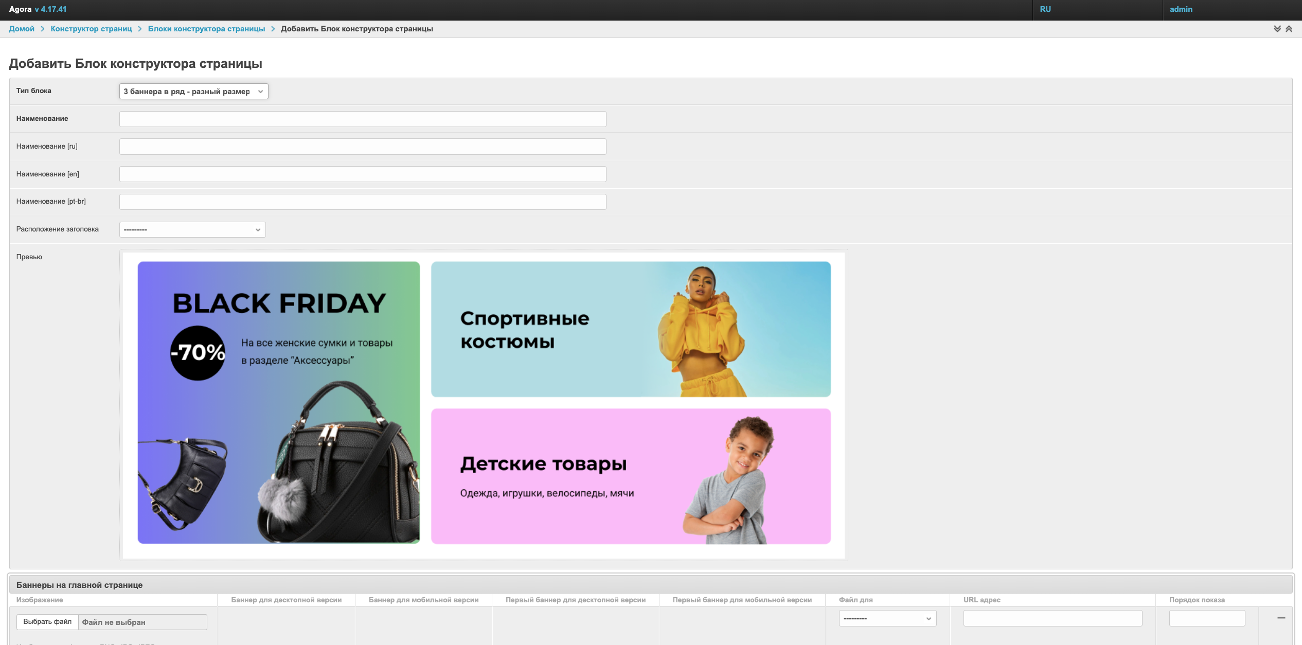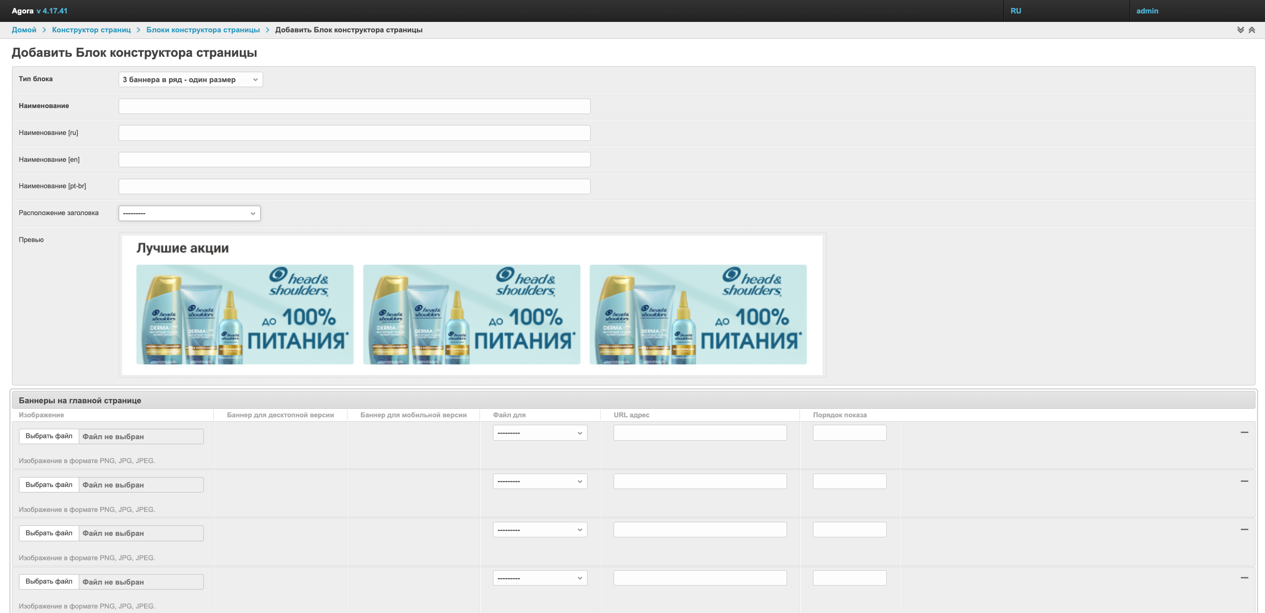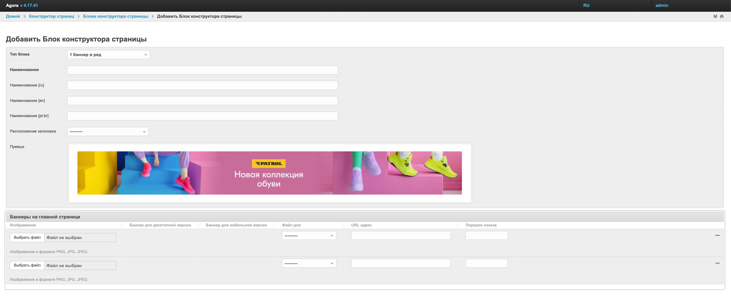 В блоке Баннеры на главной странице можно загрузить изображения для баннеров. Для этого нужно нажать на "+".