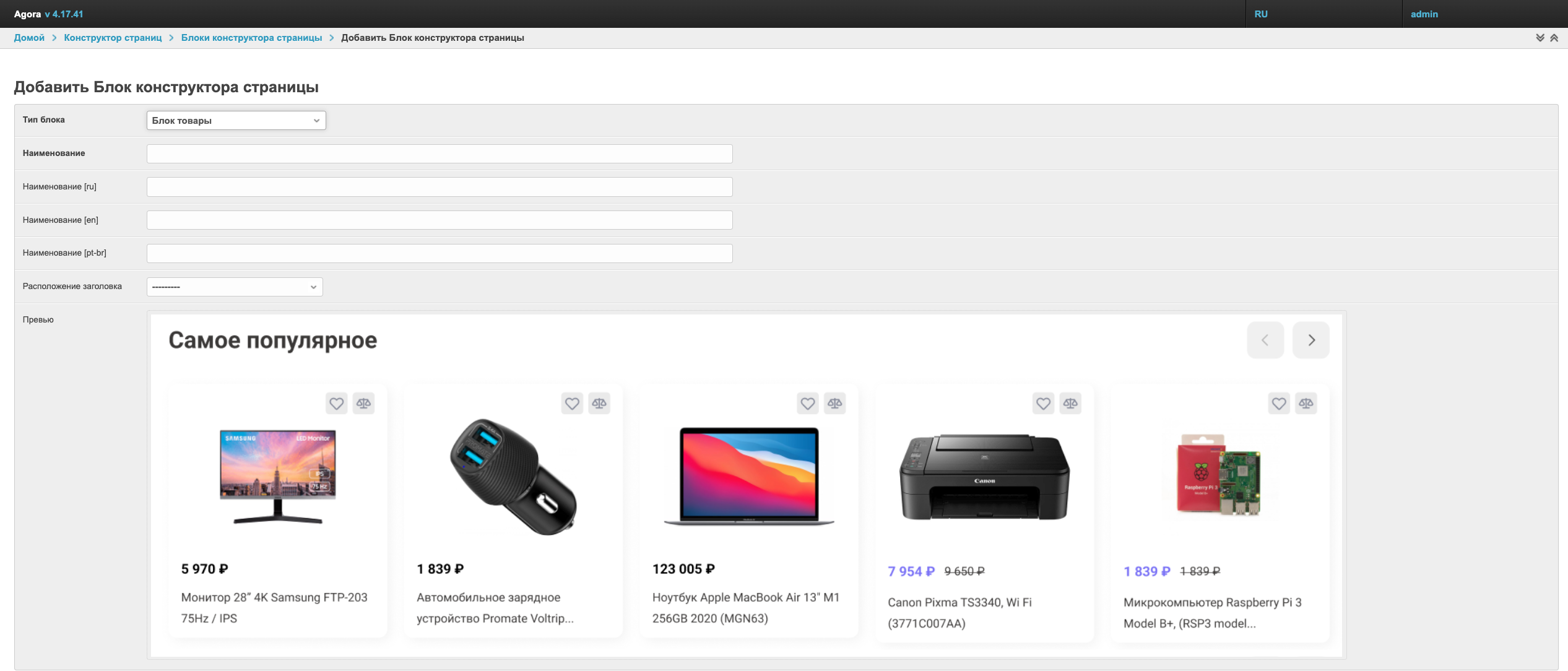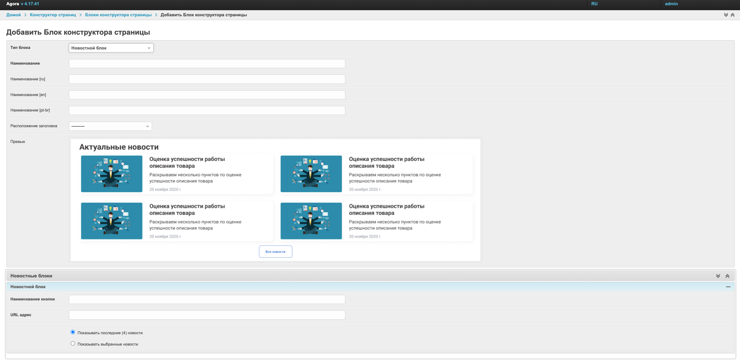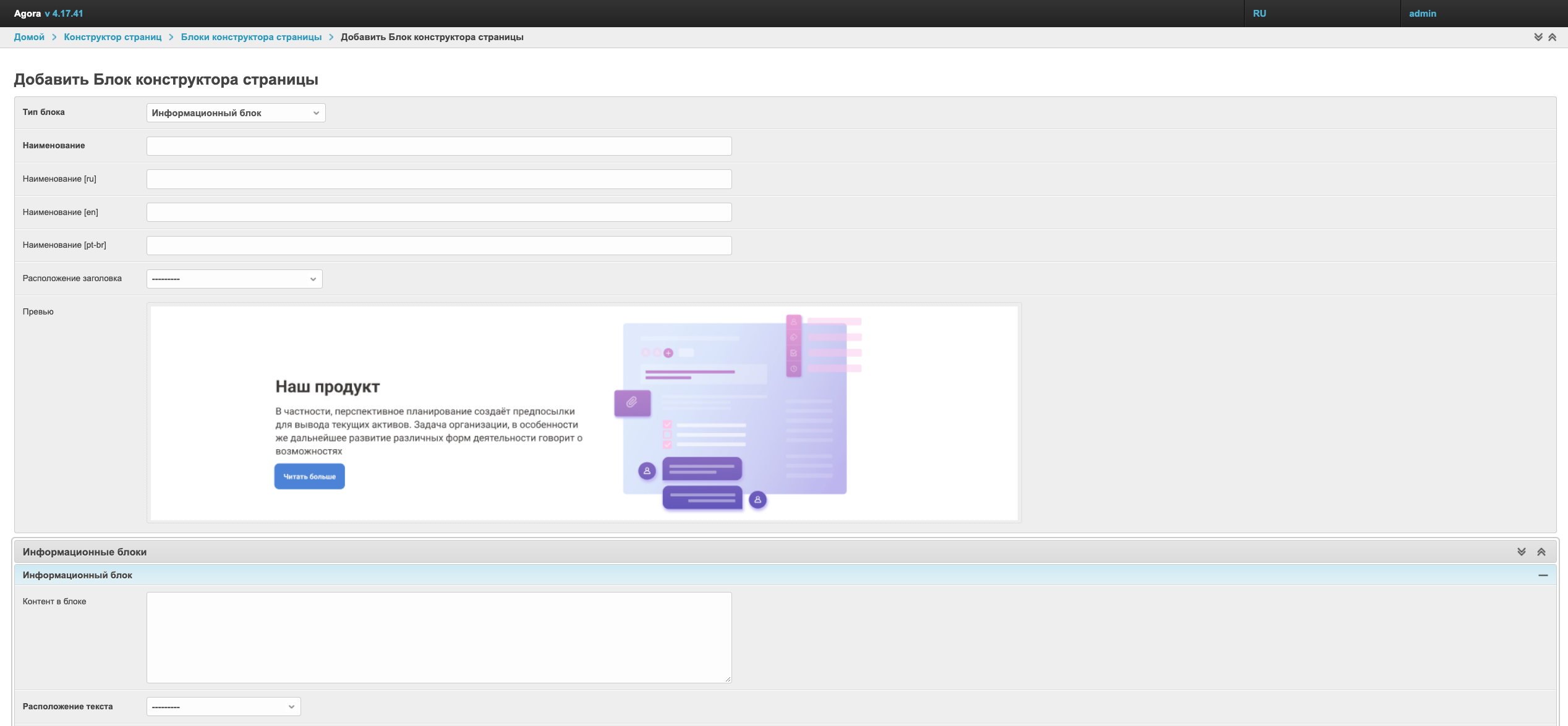 На открывшейся странице нужно заполнить поля для добавления нового блока конструктора страницы.