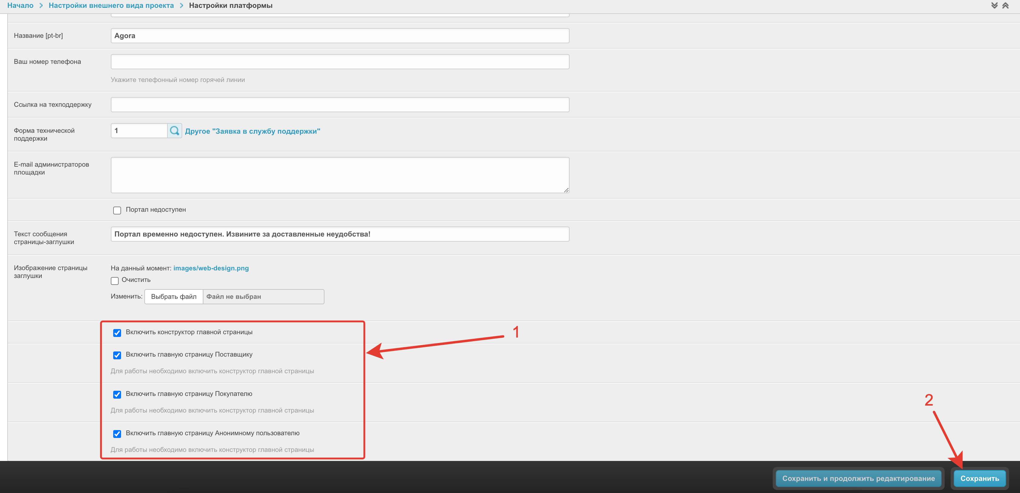 Можно использовать стандартный вид главной страницы или же настроить ее индивидуально через конструктор. Подключение конструктора главной страницы выполняется через панель администратора. Необходимо перейти в раздел Настройки платформы.