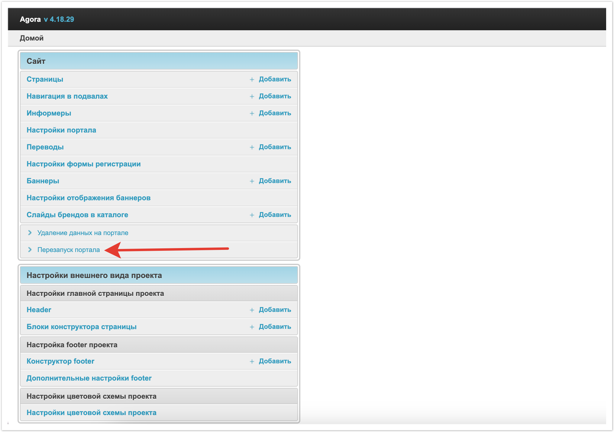Для того, чтобы выполнить перезапуск проекта нужно зайти в панель администратора. Для этого нужно перейти по адресу название_проекта.agora.ru/admin и авторизоваться. Далее нужно нажать Перезапуск портала.