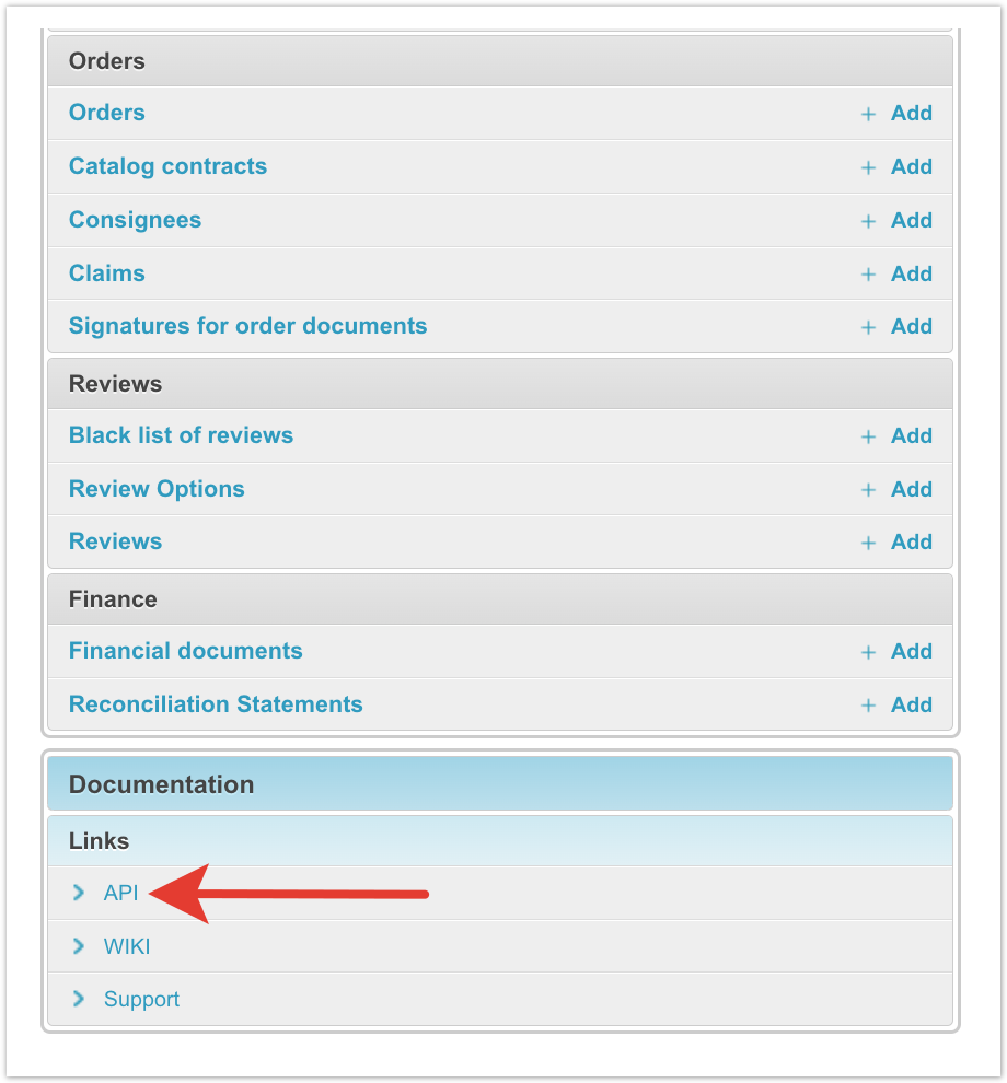 To go to the documentation, select the API section in the admin panel or follow the link.