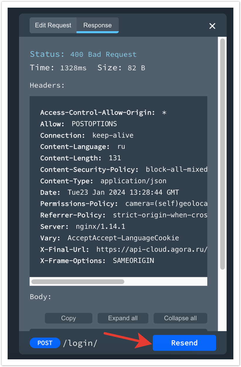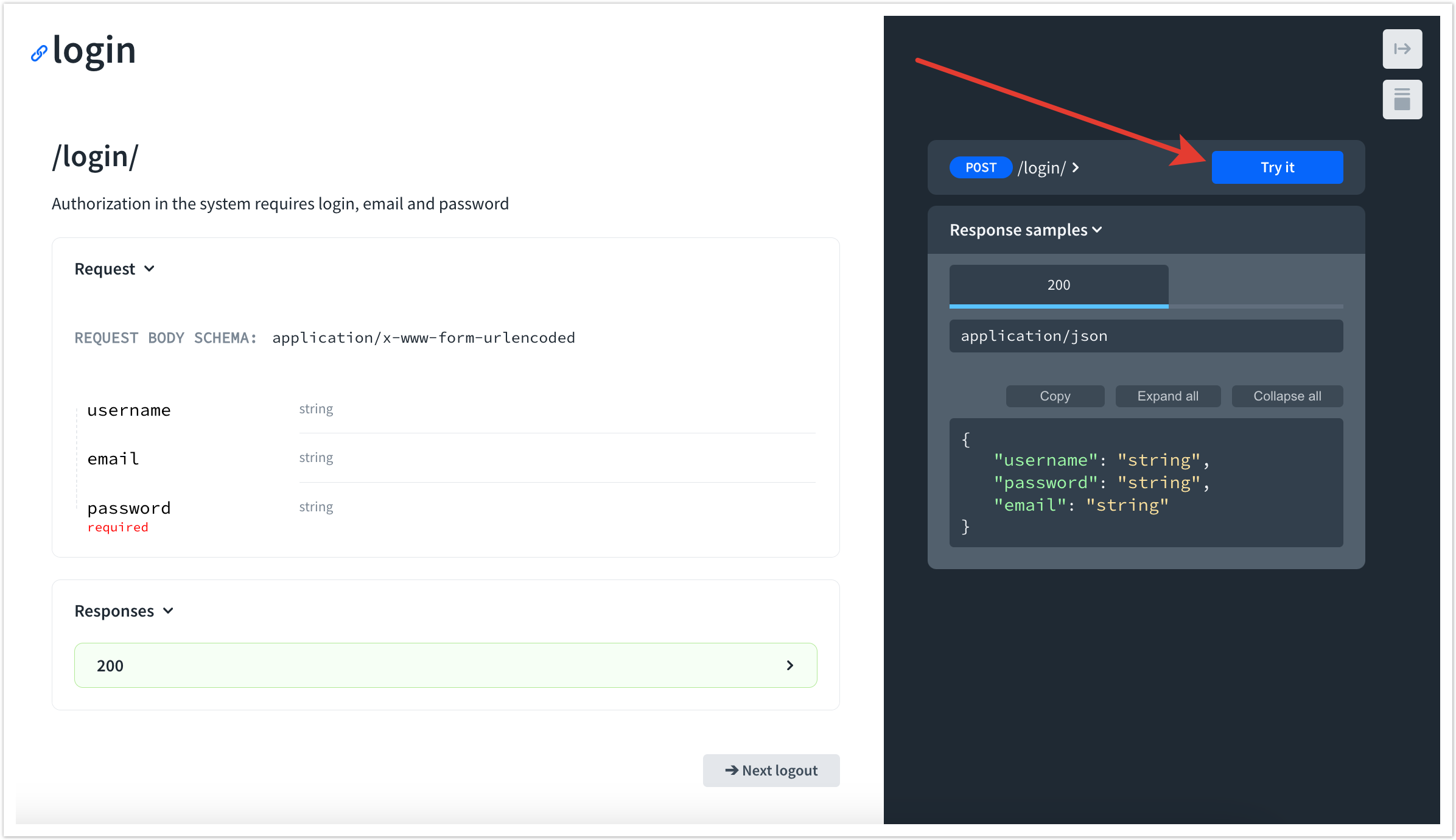To check the operation of the API, you can send a test request from the corresponding subsection of the documentation: