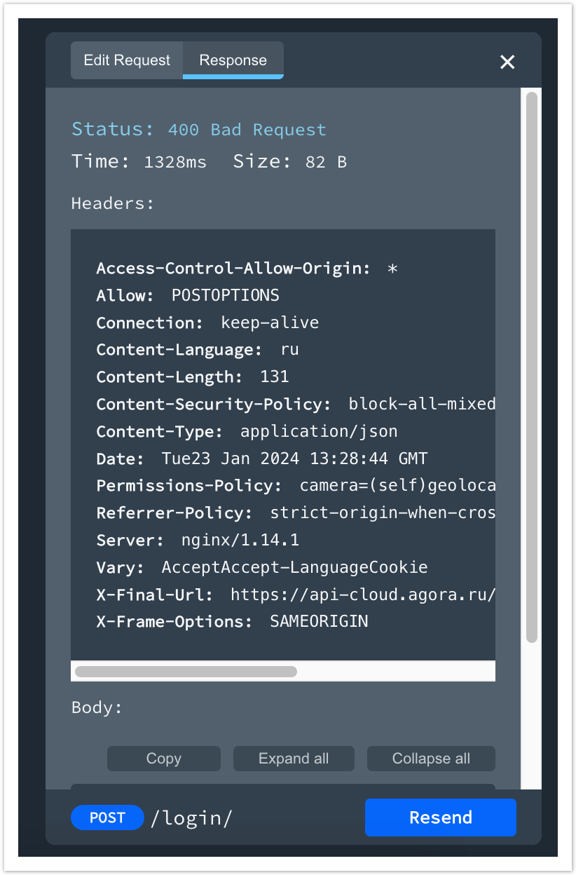 All errors are presented as human- and machine-readable status. The response body contains more detailed information about the error and is formed depending on its type. Most errors contain the "detail" key in the body. Example: