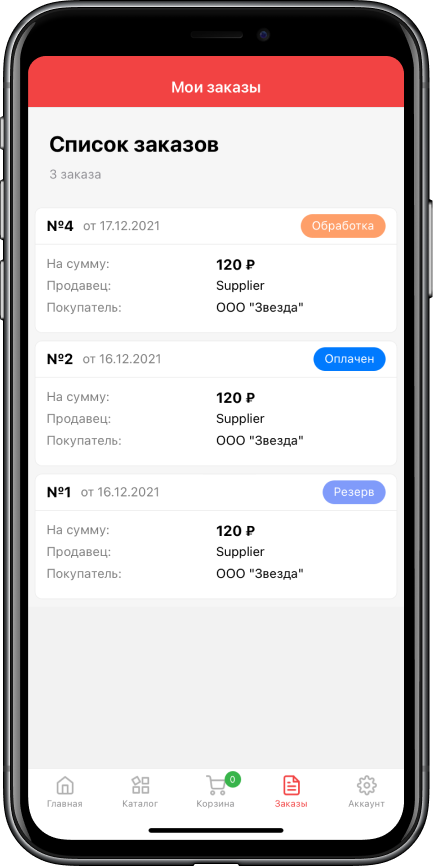 Для просмотра списка оформленных заказов, или конкретного заказа. Для перехода в заказ необходимо нажать на него. Так же доступна возможность повторить заказ и создать рекламацию по заказу.