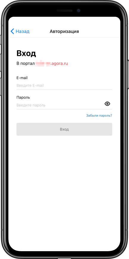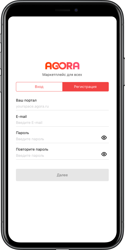 На этом шаге указывается адрес портала вида адреспортала.agora.ru для авторизации/регистрации. При выборе вкладки Вход будет происходить дальнейшая авторизация по уже существующему логину и паролю. При выборе вкладки Регистрация можно зарегистрироваться на портале, если логина еще нет.