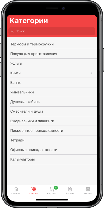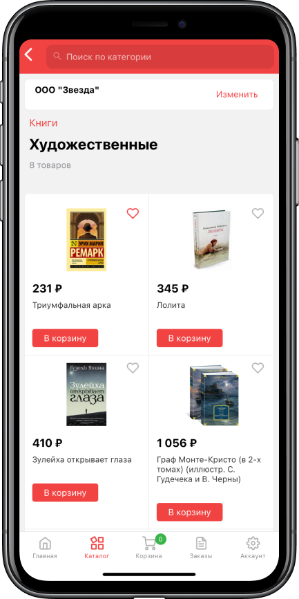 Для просмотра категории товаров. Внутри категорий можно видеть непосредственно товары и их цену. Из каталога товары можно добавить в Избранное, нажав на символ сердца, и в Корзину, нажав на соответствующую кнопку.