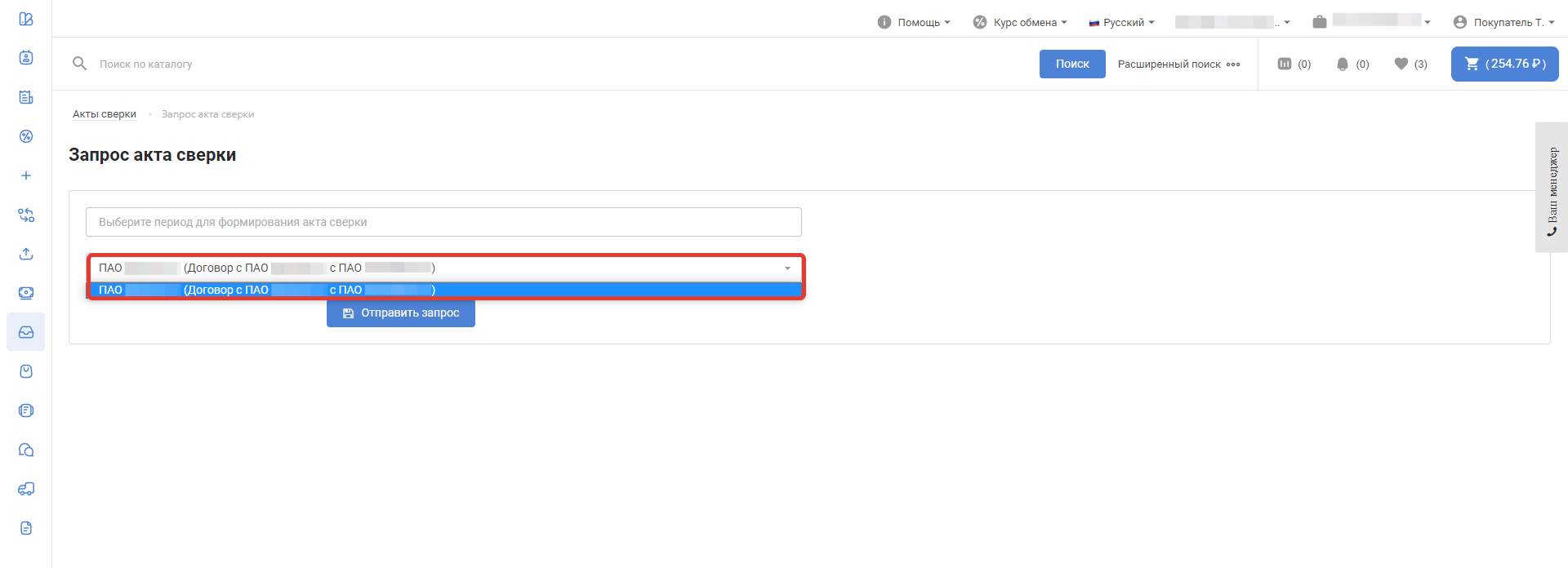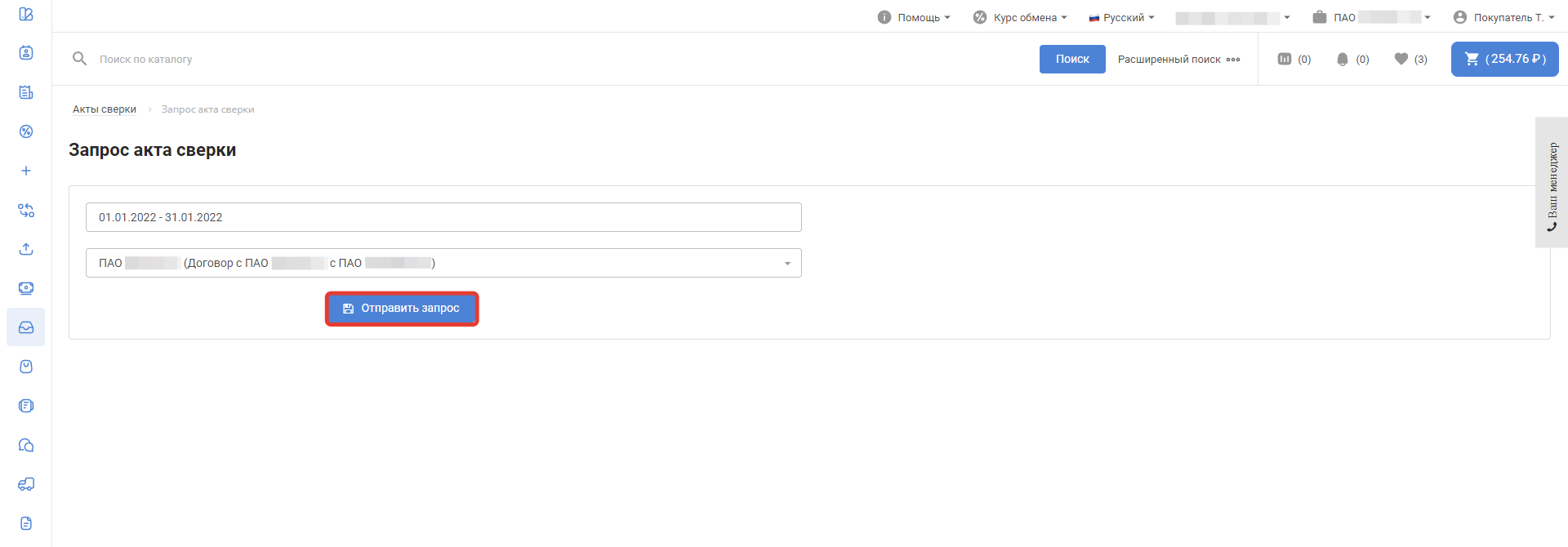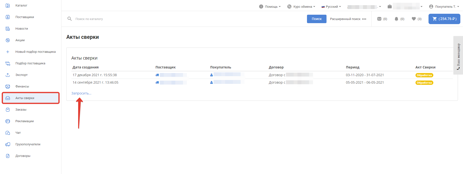 Для просмотра ранее созданных или запроса нового Акта сверки перейдите в раздел Акты сверки и нажмите кнопку Запросить: