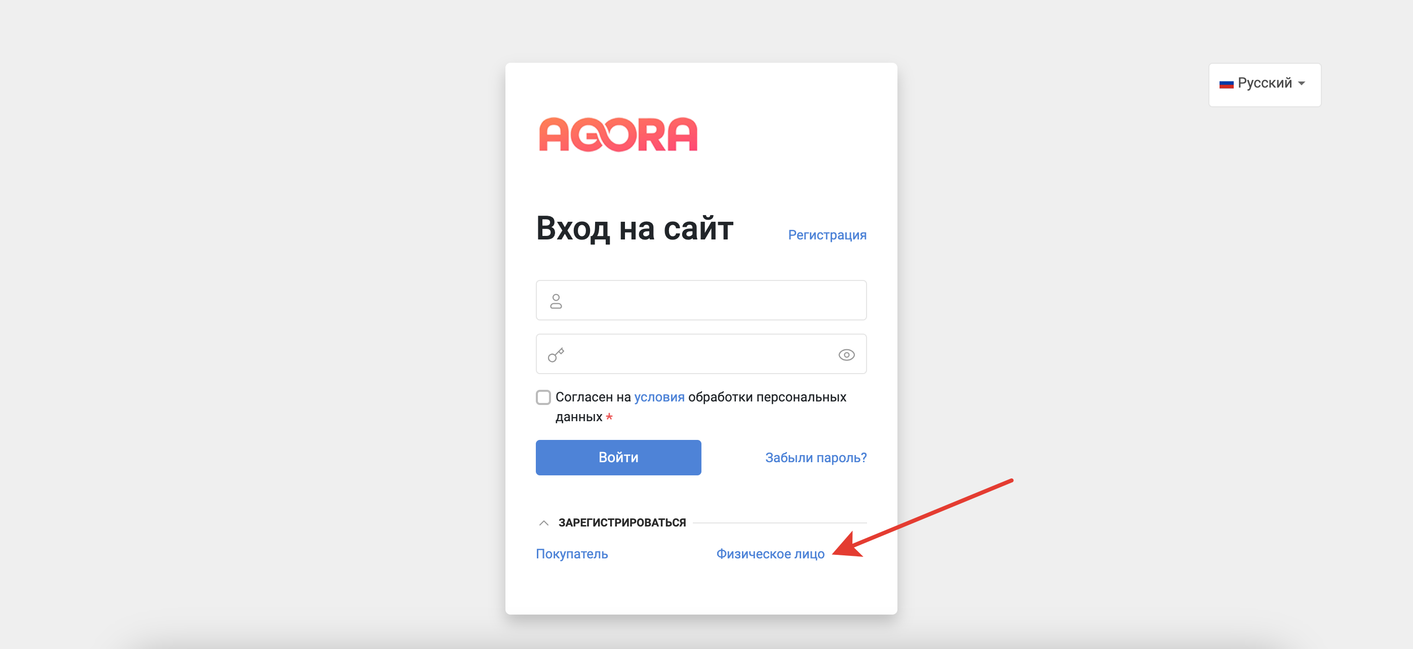 Для регистрации пользователю необходимо перейти на страницу регистрации, нажав на кнопку Физическое лицо в блоке Зарегистрироваться.