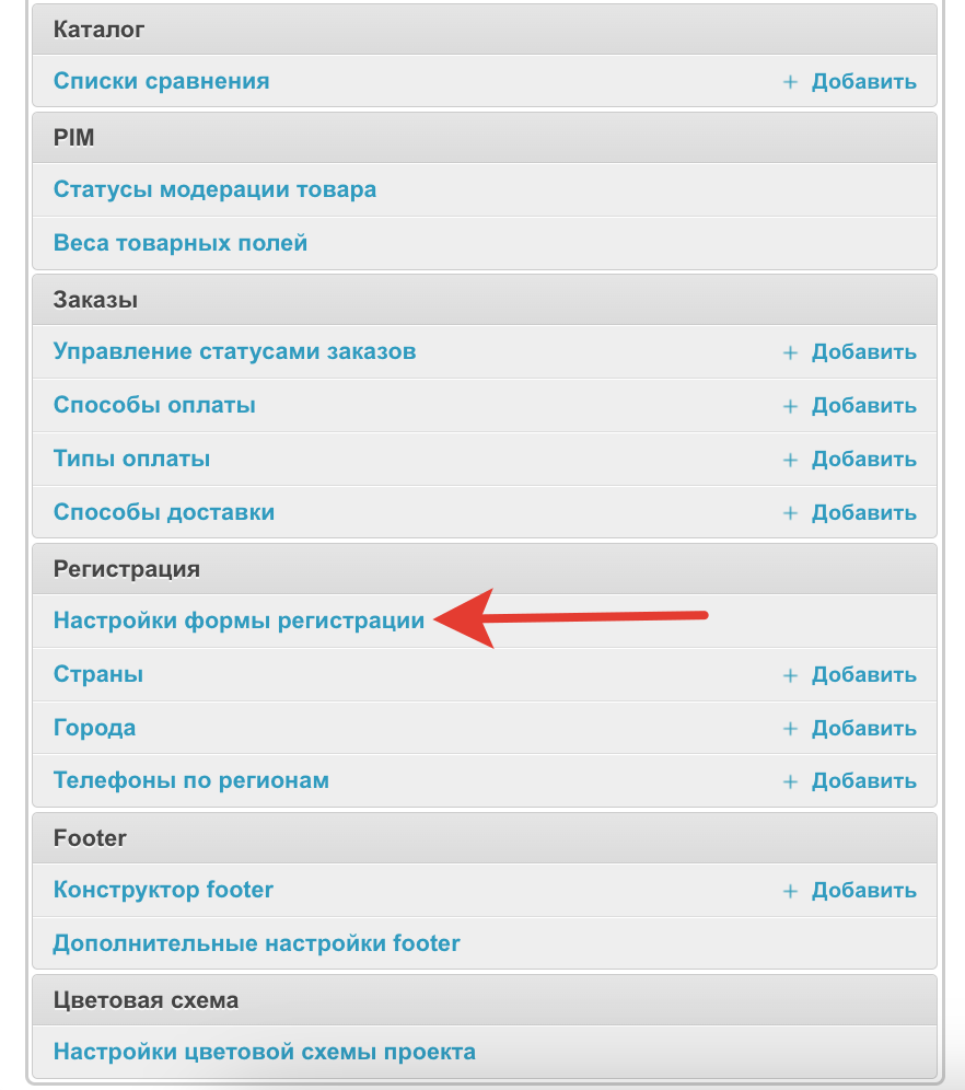 Чтобы настроить форму регистрации, в административной панели зайдите в раздел Настройки формы регистрации.