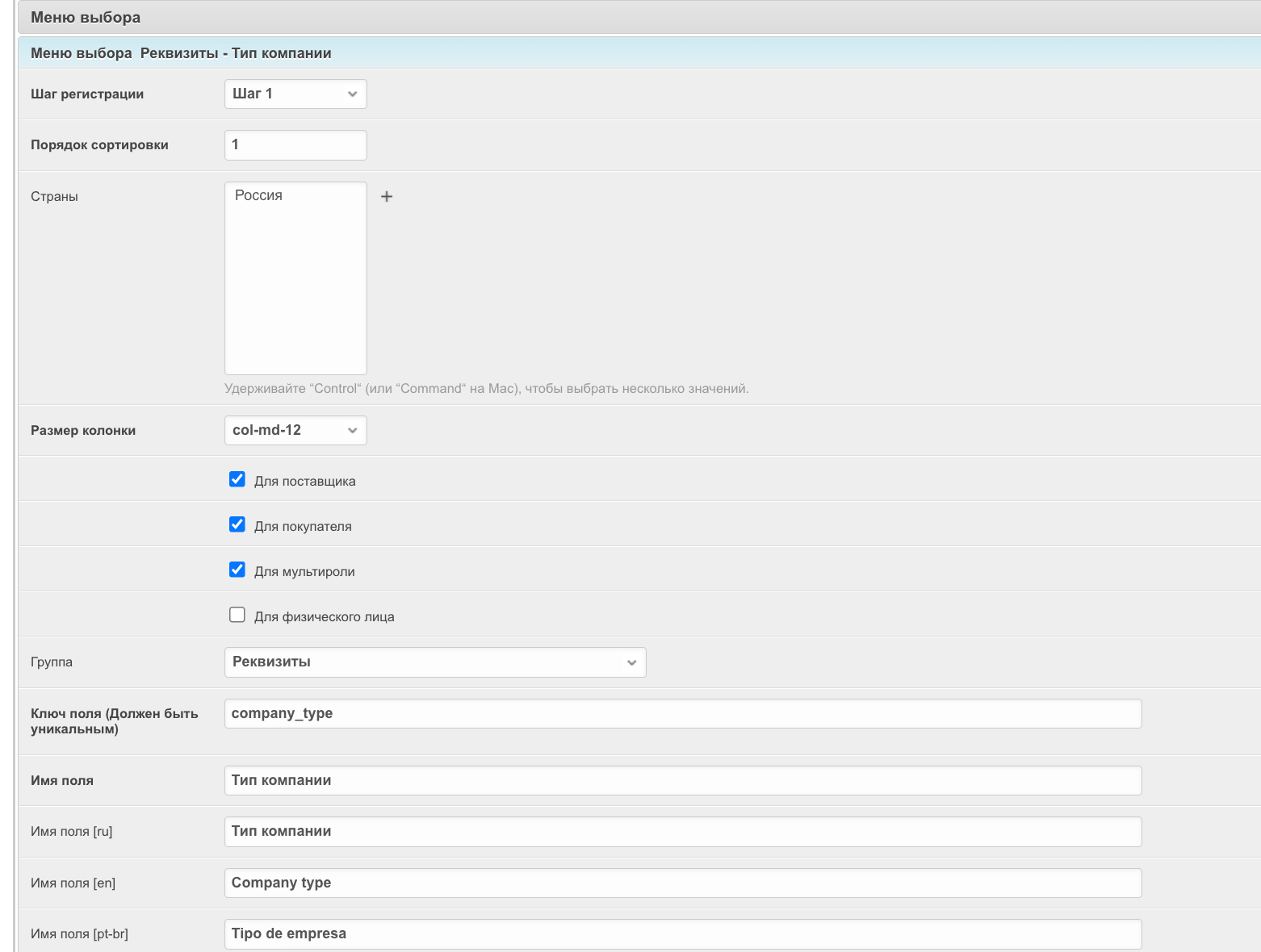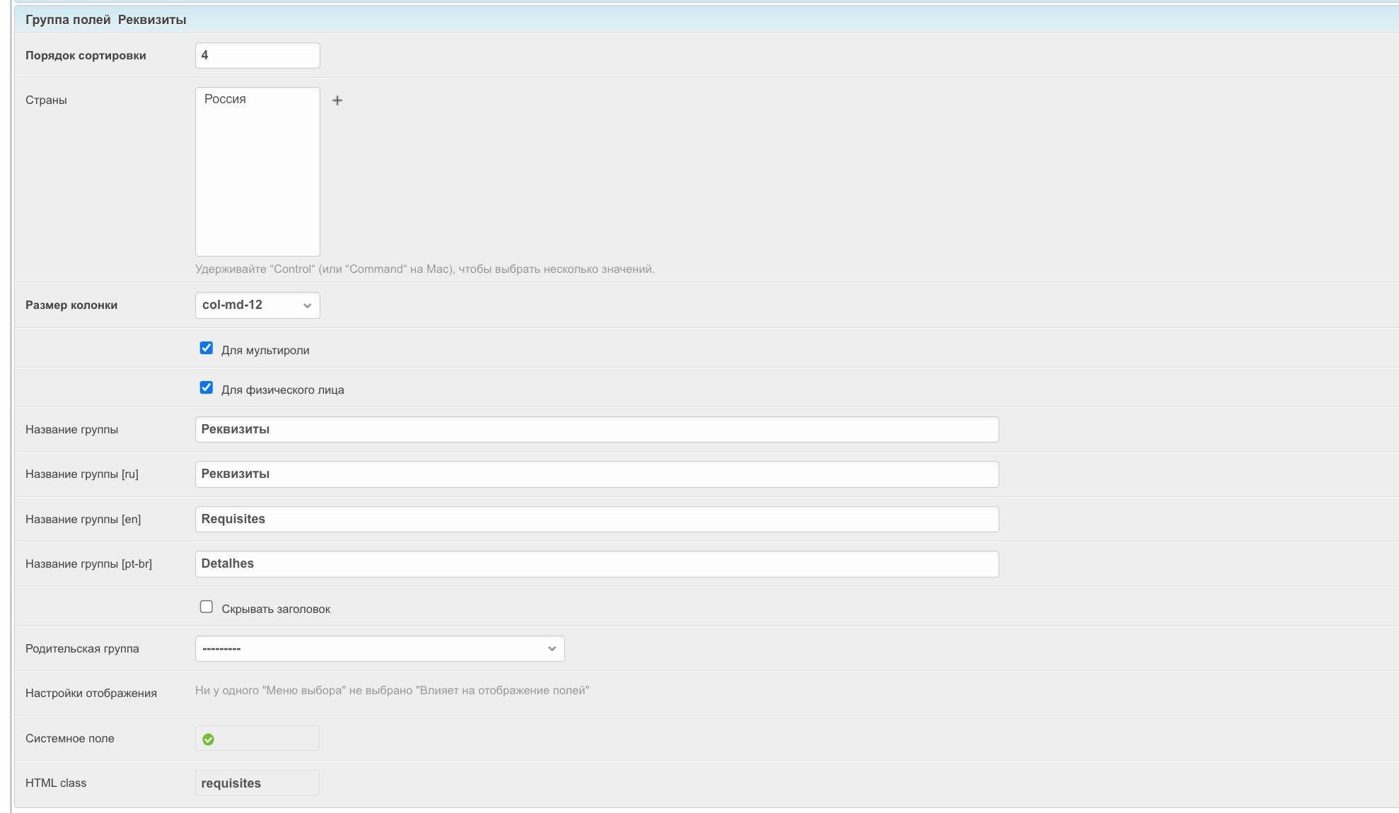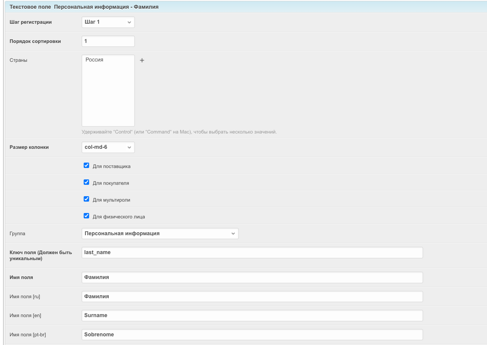 - Страны - заведенные группы полей будут показаны в форме регистрации только для выбранной страны.