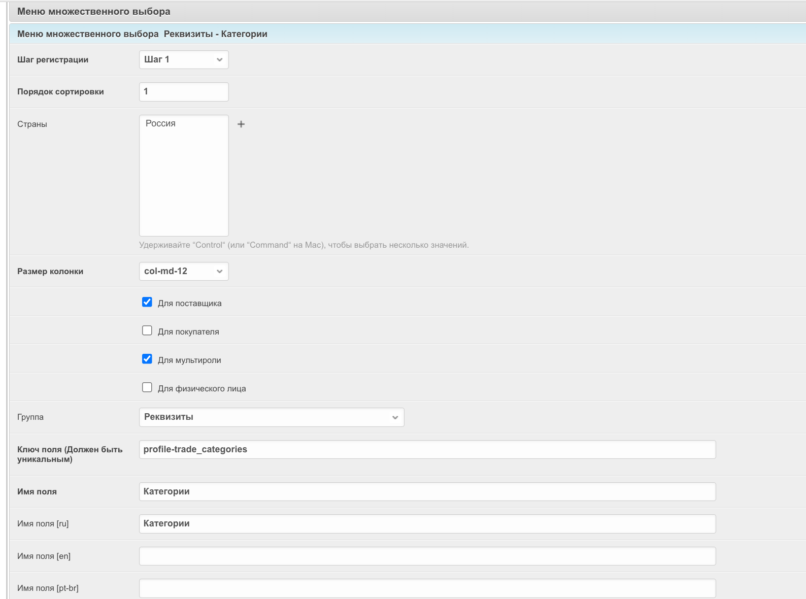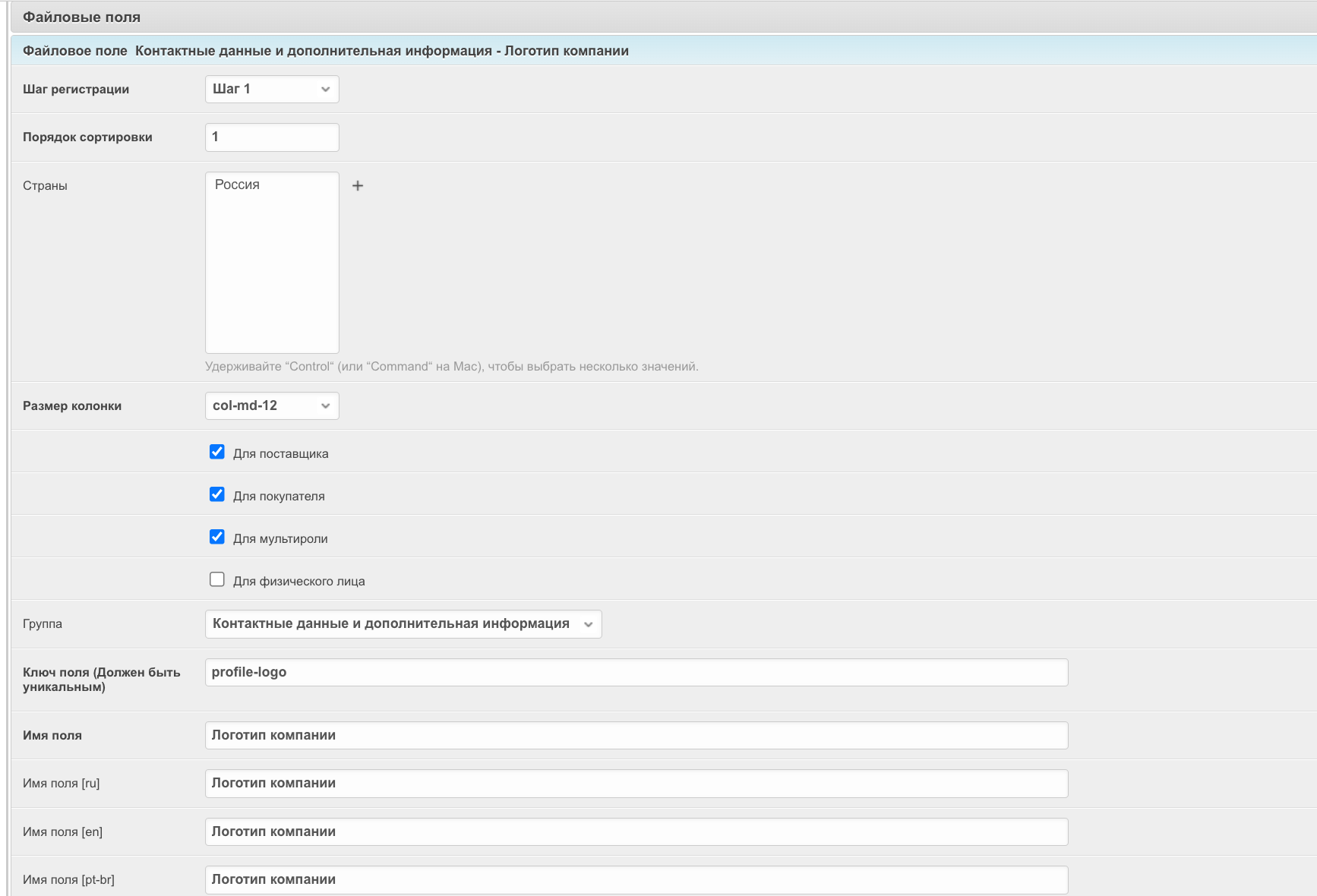 - Для поставщика, Для покупателя, Для мультироли, Для физического лица - если выбран данный чекбокс, поле будет отображаться при регистрации выбранных ролей.