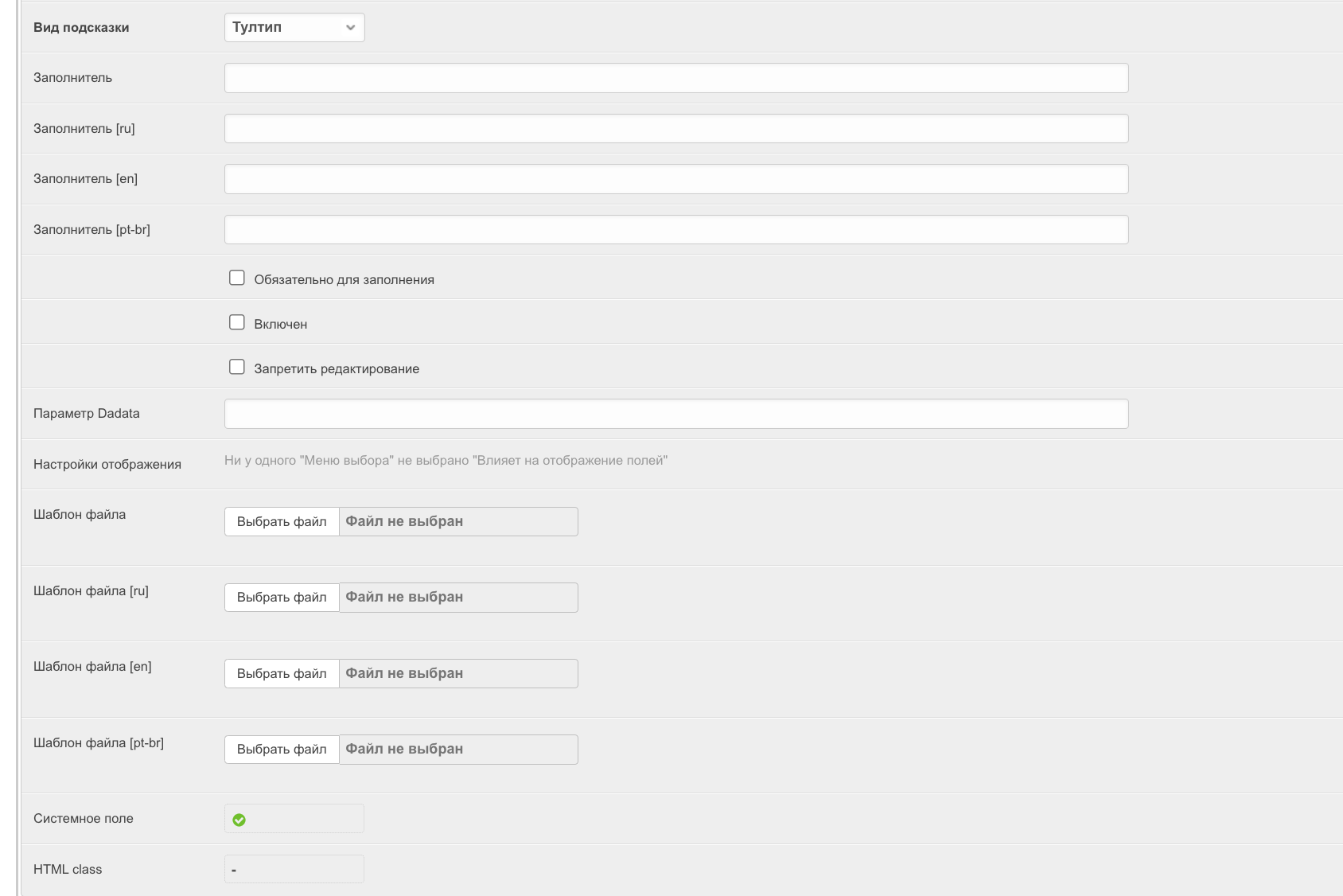 Данный чекбокс может быть выбран только в одном Меню множественного выбора. - Системное поле - признак полей - системное (нельзя удалять) или не системное (можно добавлять или удалять).