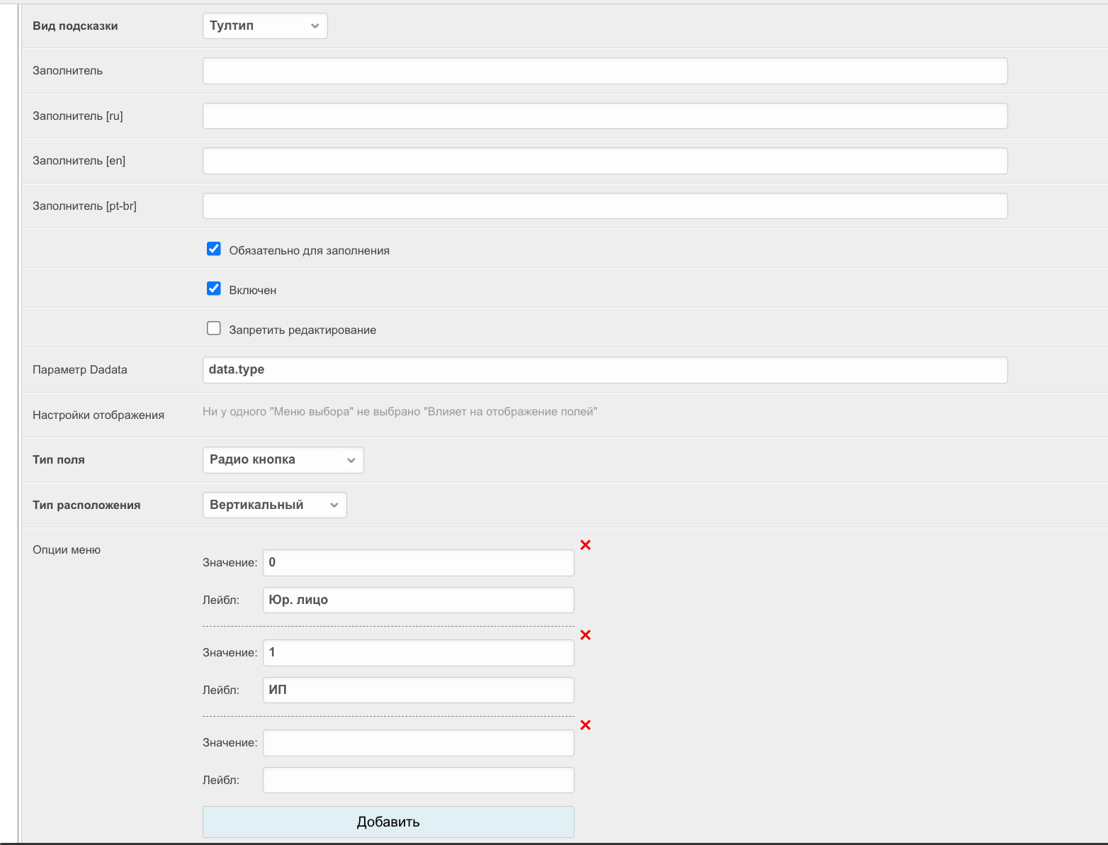 - Опции меню - Значение (опции, отображающиеся при выборе Радио кнопки), Лейбл (опции, отображающиеся в выпадающем списке). Выбранные здесь поля будут отображаться в поле Настройка отображения.