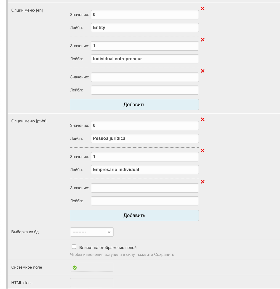- Влияет на отображение полей - после выбора одного из значений в поле Выборка из бд выберите данный чекбокс для изменения последующей логики регистрации (например, при выборе страны Россия будут отображаться поля ИНН, ОГРН и проч., при выборе Бразилии - бразильские налоговые идентификаторы).