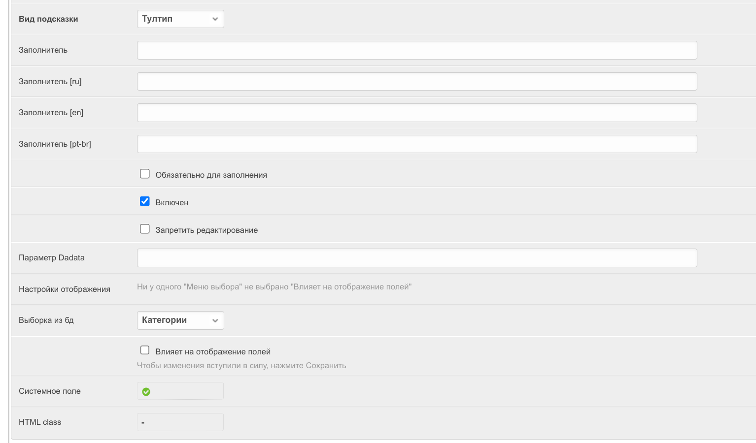 - Выборка из бд - для более быстрого выбора названий категорий. Если значение выбрано, то чтобы его переопределить, нужно выбрать чек-бокс Влияет на отображение полей.