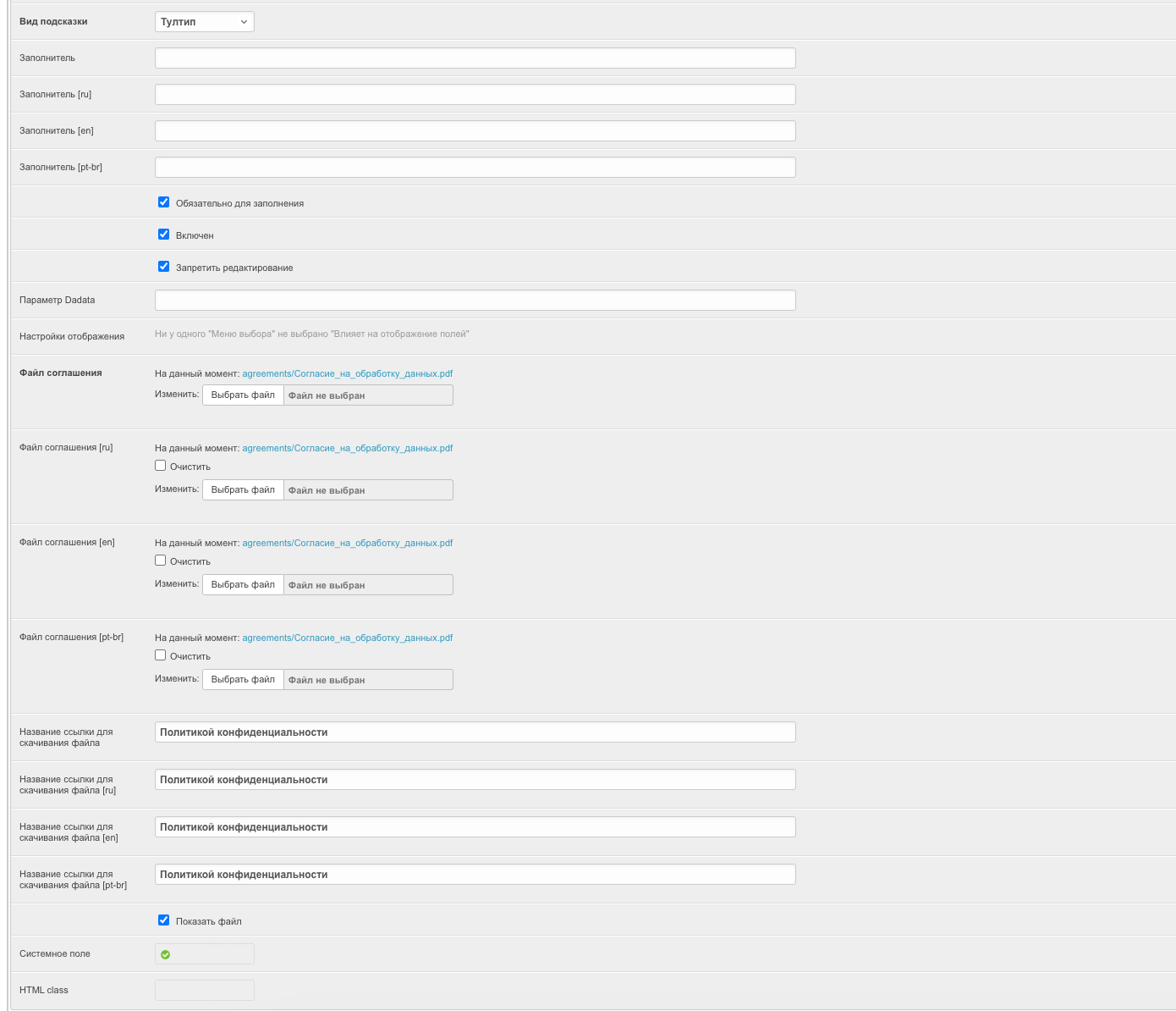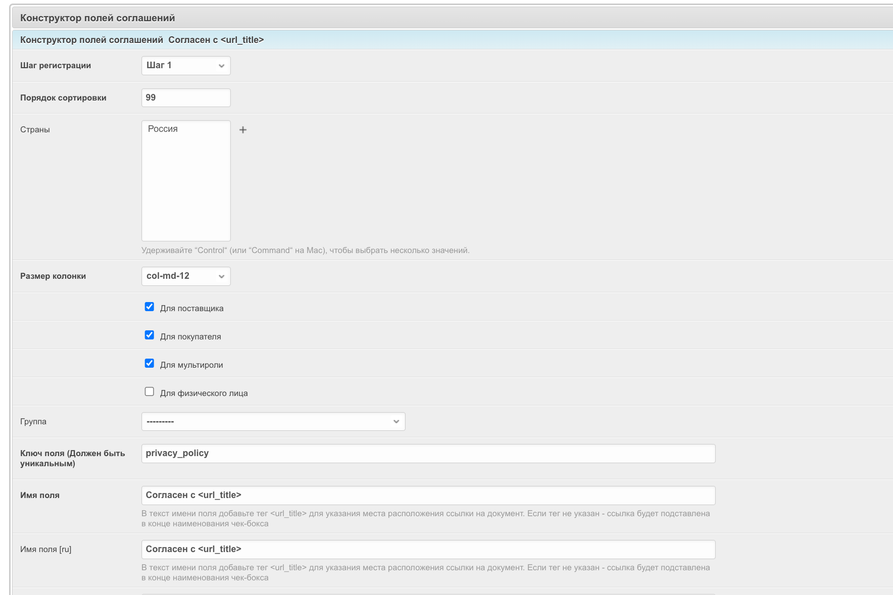 В Системе заведены поля с политикой конфиденциальности, условия пользовательского соглашения, условия обработки персональных данных. Дополнительно можно добавить еще один Конструктор полей соглашений.