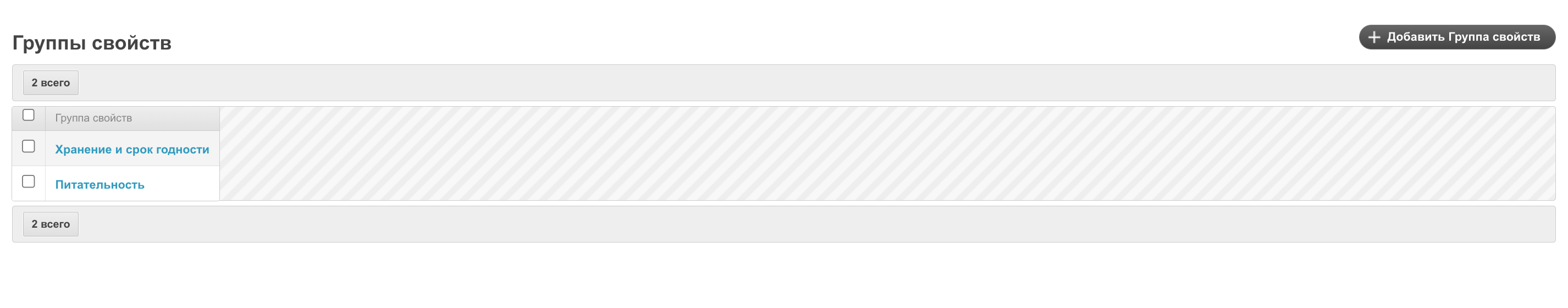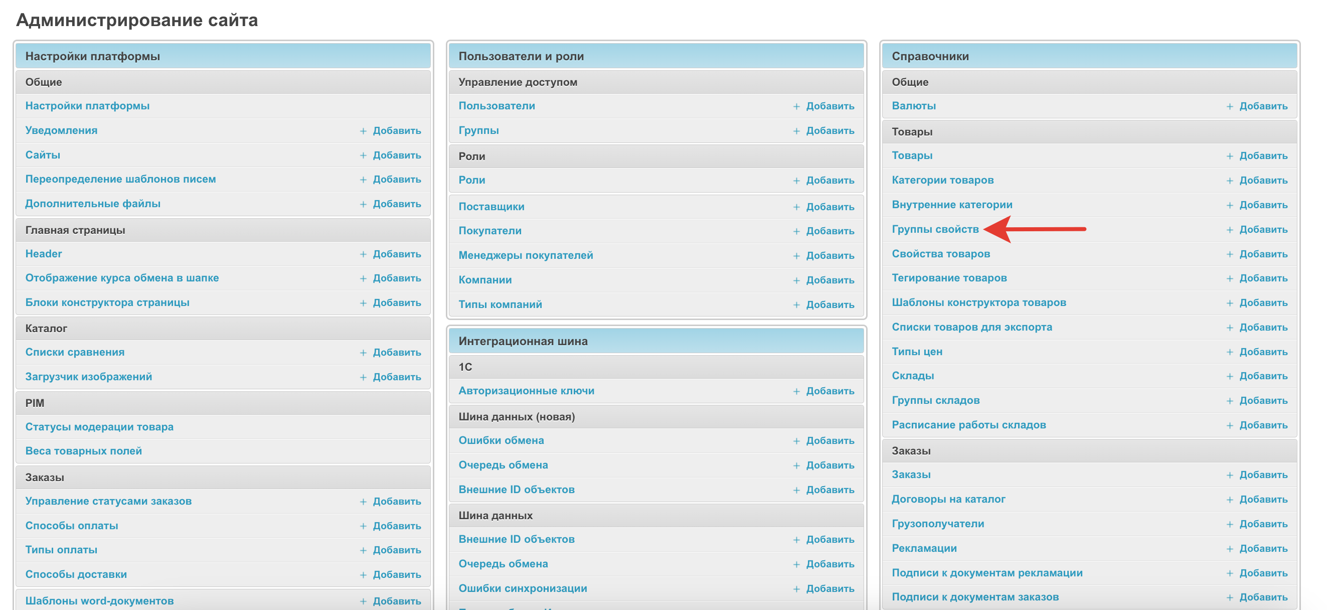 На странице выводятся все группы свойств, добавленные на платформе.