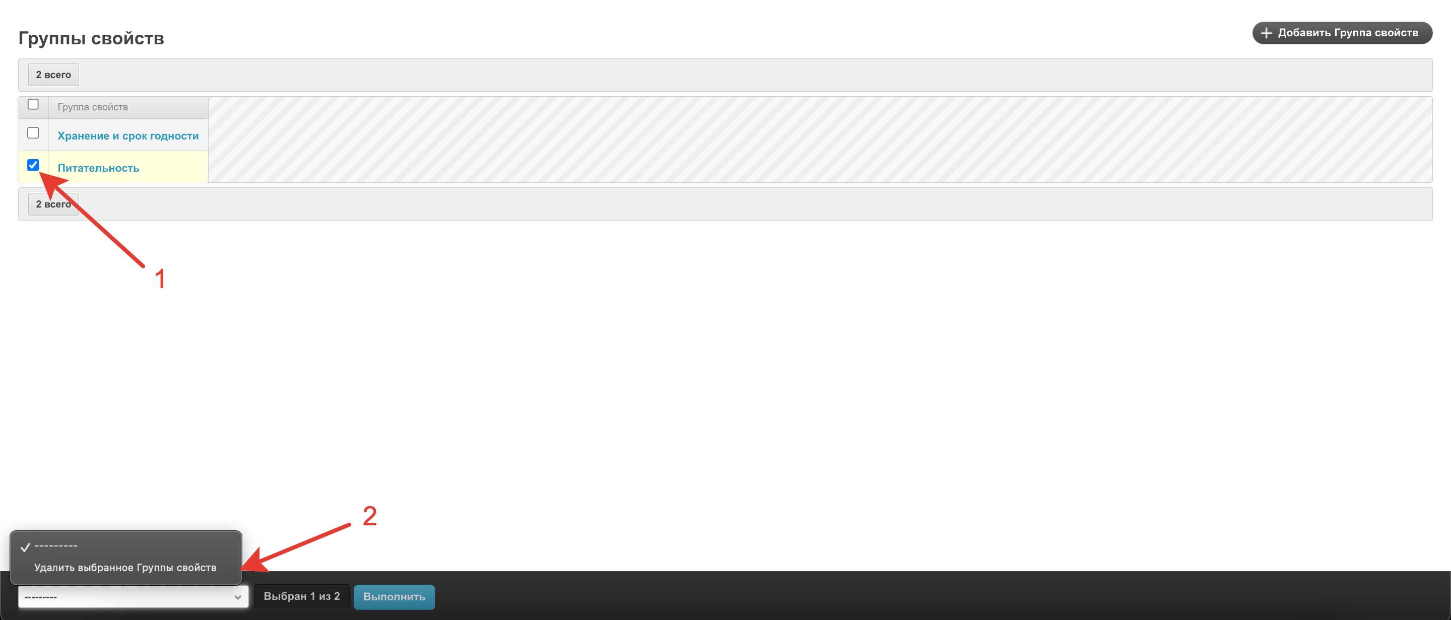 Для удаления выделите нужную группу свойств и далее в выпадающем меню внизу страницы выберите Удалить выбранное Группы свойств.