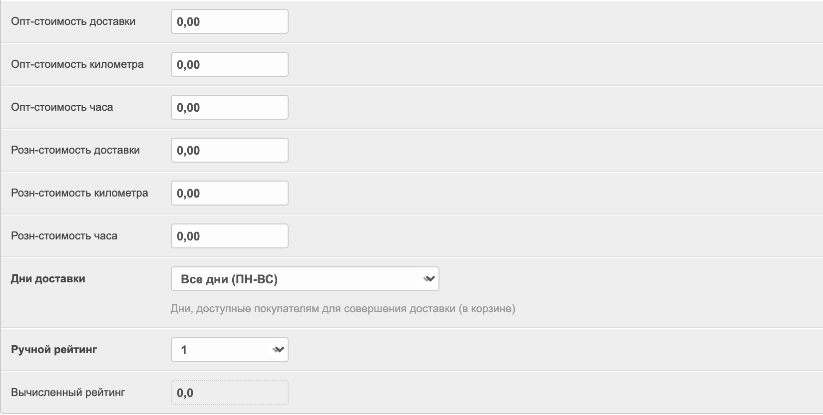Опт-стоимость доставки, Опт-стоимость километра, Опт-стоимость часа, Розн-стоимость доставки, Розн-стоимость километра, Розн-стоимость часа - стоимость доставки товара. Эти данные можно также отредактировать в личном кабинете поставщика в разделе Настройки > Основные настройки.