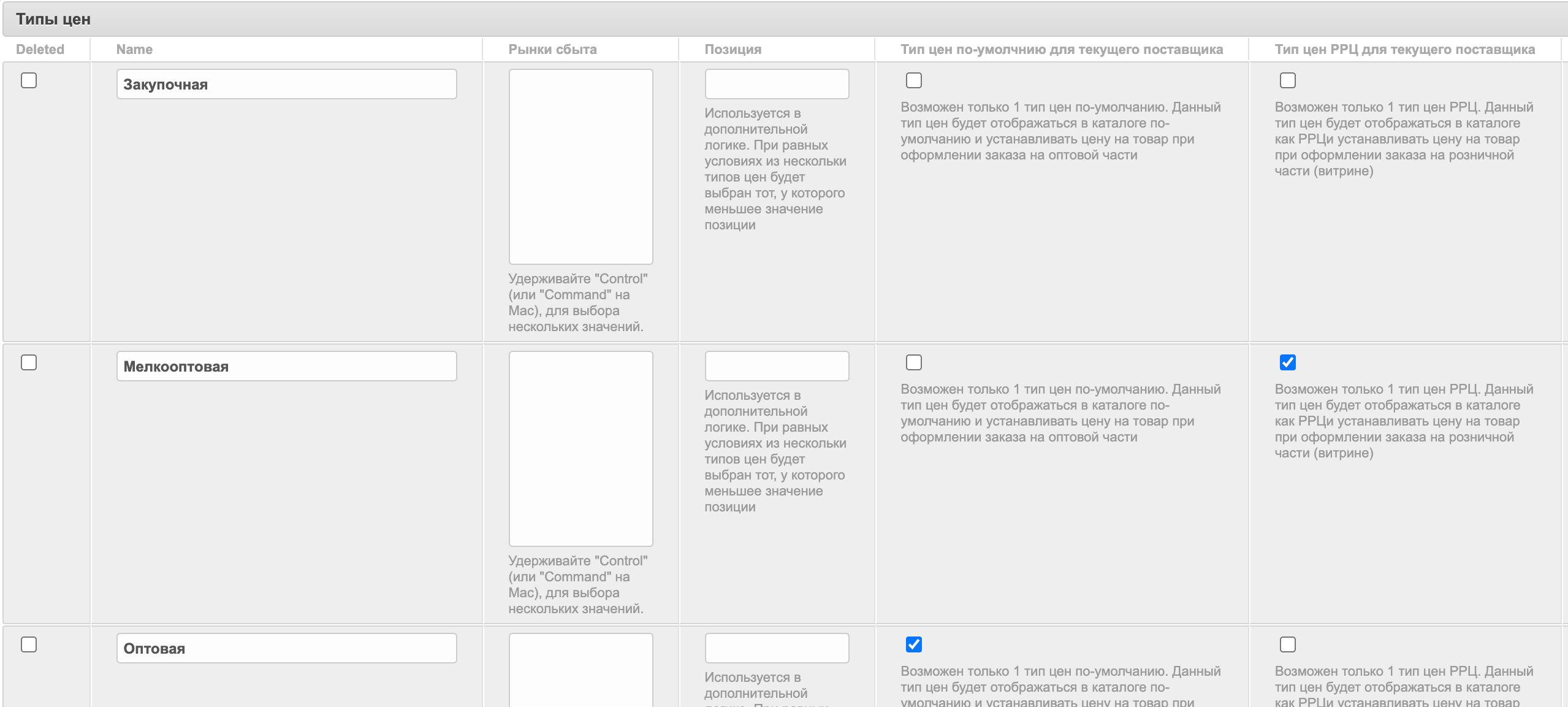 Для одного из типов цен отметьте чек-боксы Тип цен по умолчанию для текущего поставщика и Тип цен РРЦ для текущего поставщика (РРЦ - рекомендуемая розничная цена, данная цена носит информативный характер).
