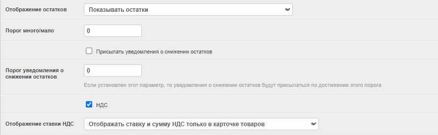 Отображение остатков – способы отображения остатков: показывать остатки (отображение количества оставшегося товара), показывать остатки/много, показывать много/мало/нет в наличии, показывать “в наличии”/”нет в наличии”, показывать только склад, если на нем присутствуют остатки.