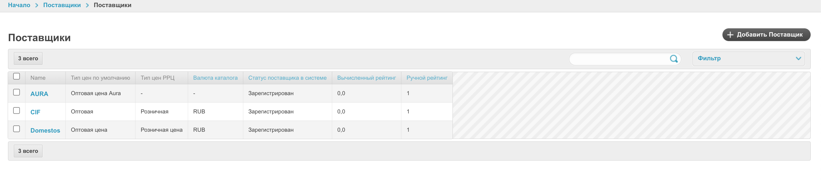 Нажмите на имя нужного поставщика, чтобы зайти на его личную страницу, или добавьте нового поставщика, нажав на кнопку Добавить (для площадок типа marketplace).