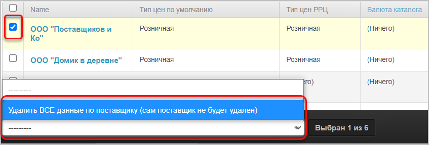 Для того, чтобы удалить все данные о поставщике, в списке поставщиков выберите нужного поставщика и внизу таблицы выберите Удалить ВСЕ данные по поставщику (сам поставщик удален не будет).