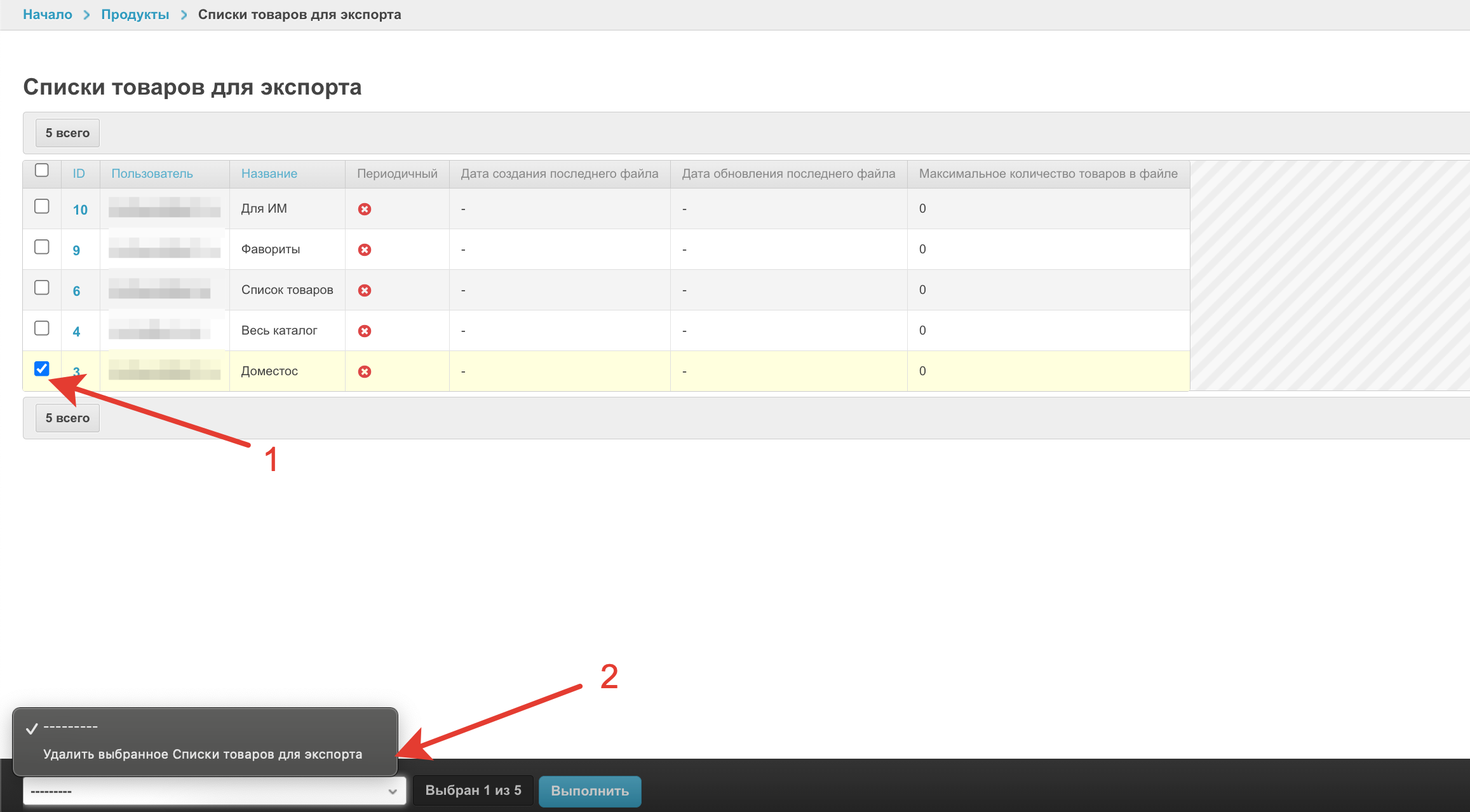 Если покупатель больше не работает на платформе, то можно удалить его списки экспорта. Для этого нужно выделить их и далее в выпадающем списке внизу страницы выбрать Удалить выбранное Списки товаров для экспорта