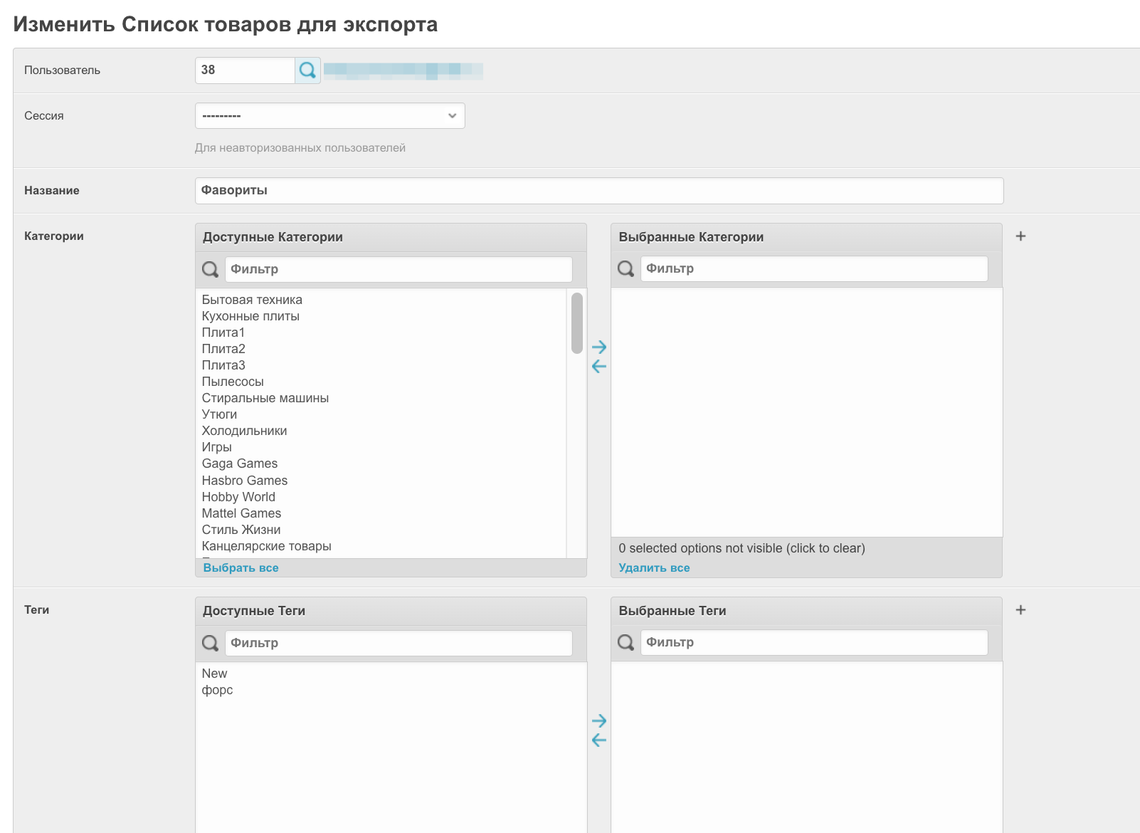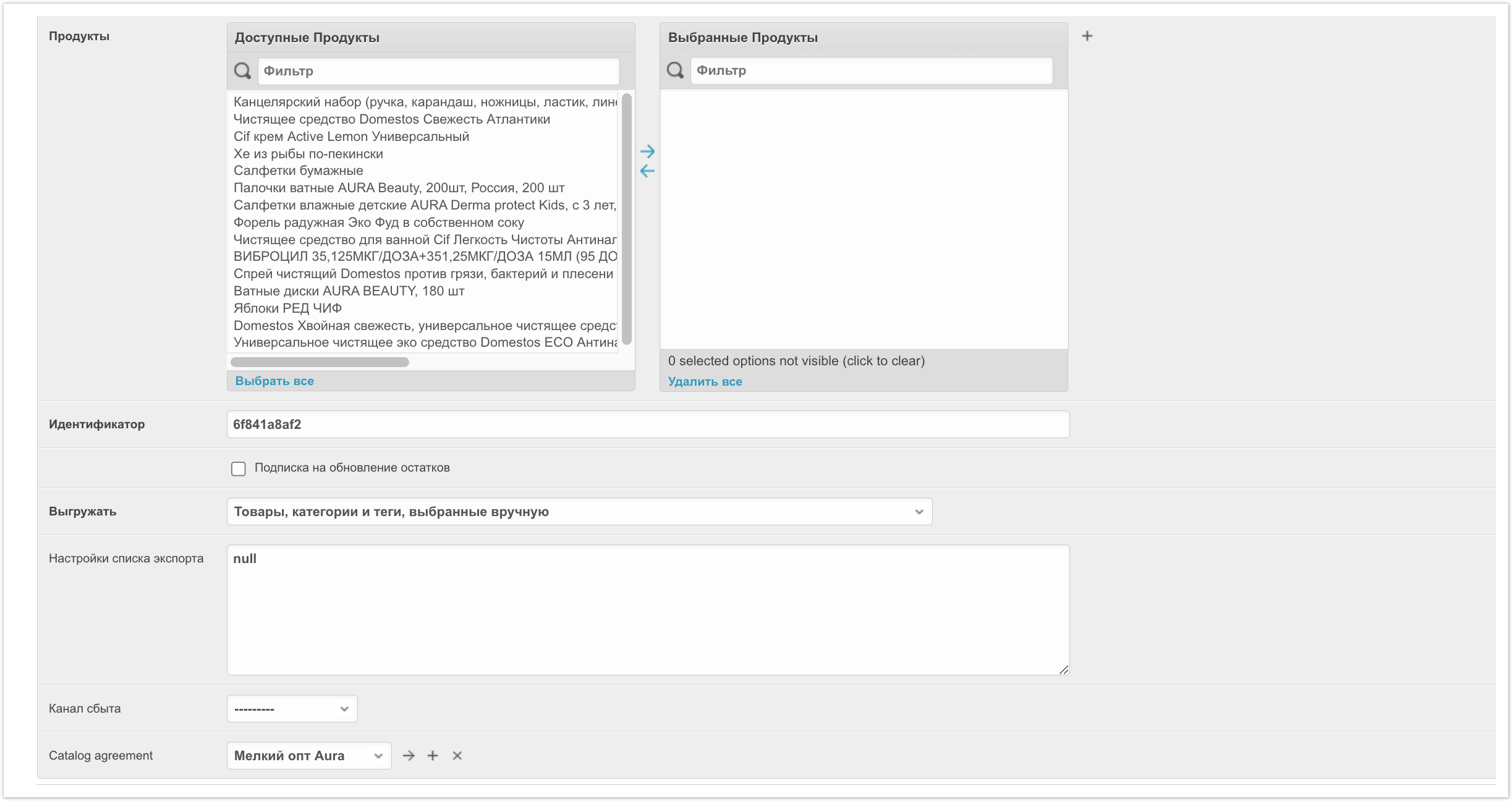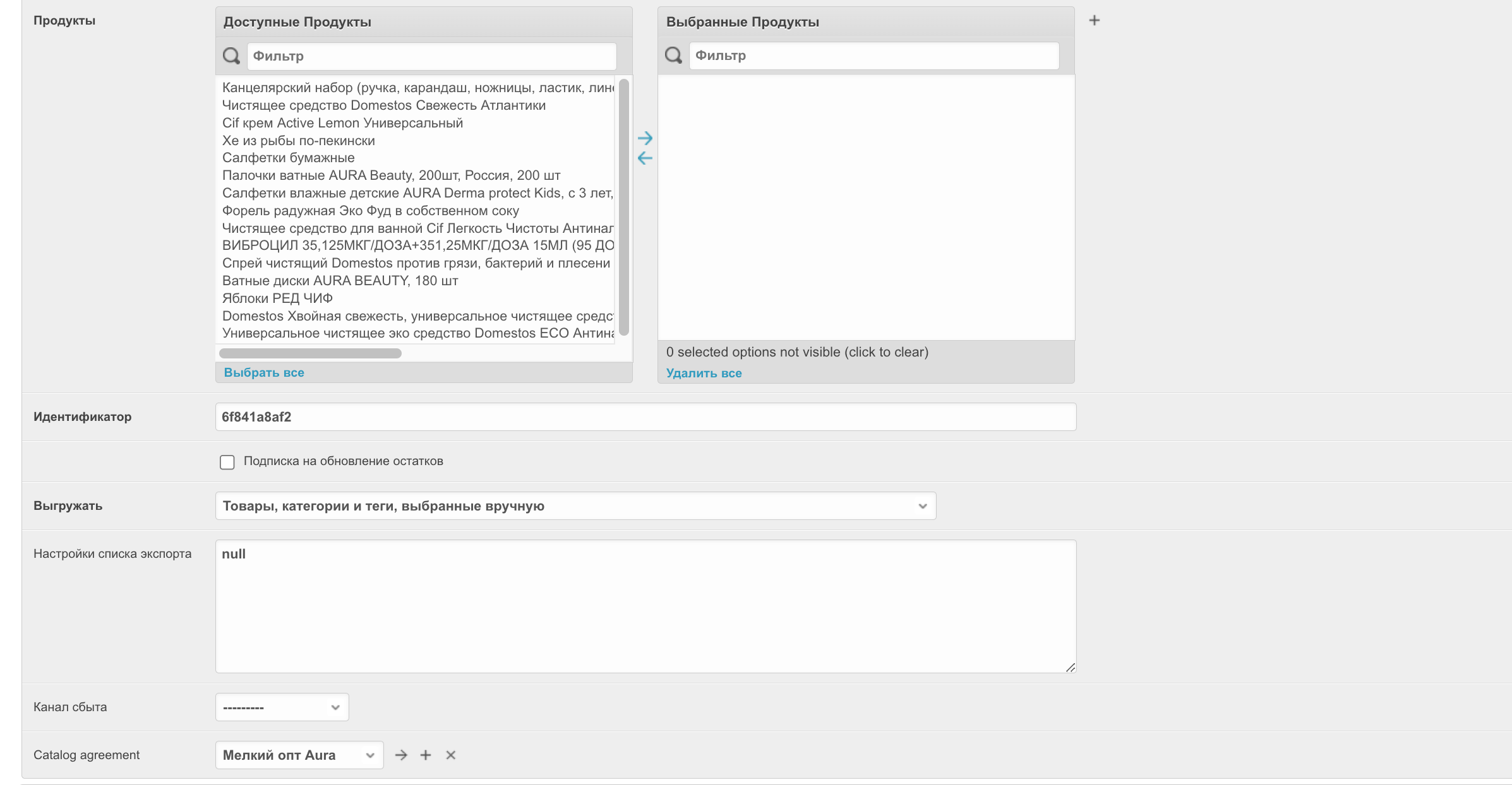 Выгружать - в этом поле выбирается, какие данные будут выгружены: Все товары, Все товары в наличии, Товары, категории и теги выбранные вручную выше.