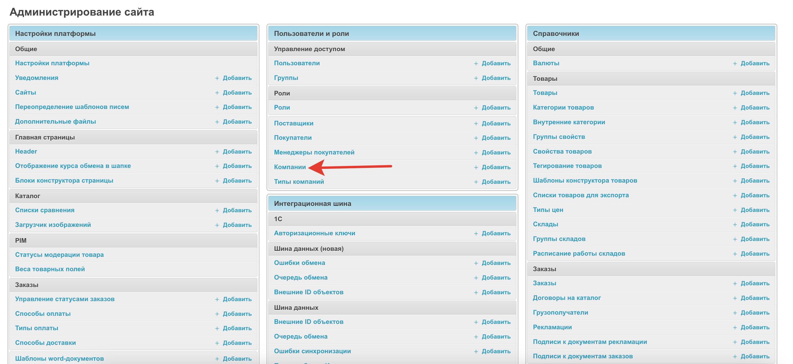 Для перехода в раздел нажмите на Компании в панели администратора.
