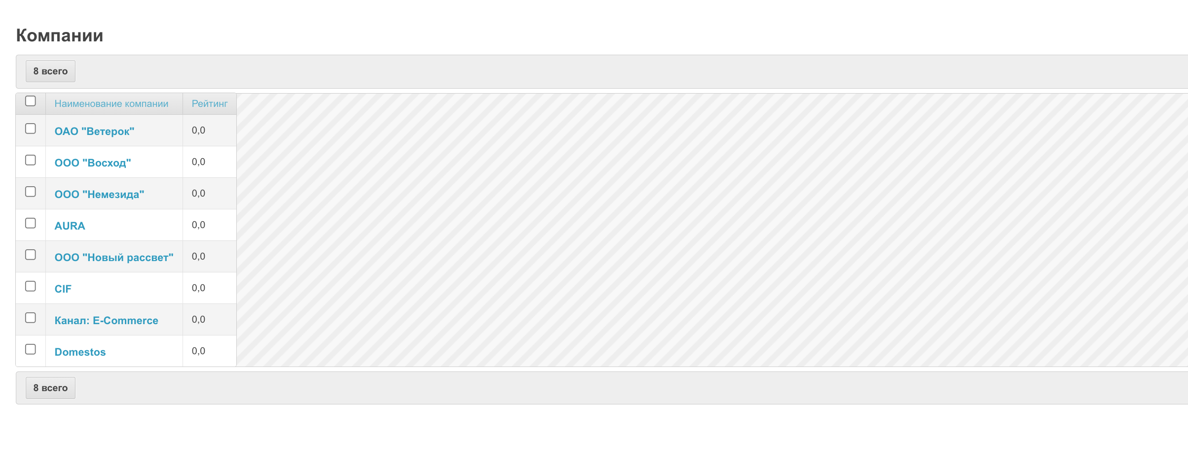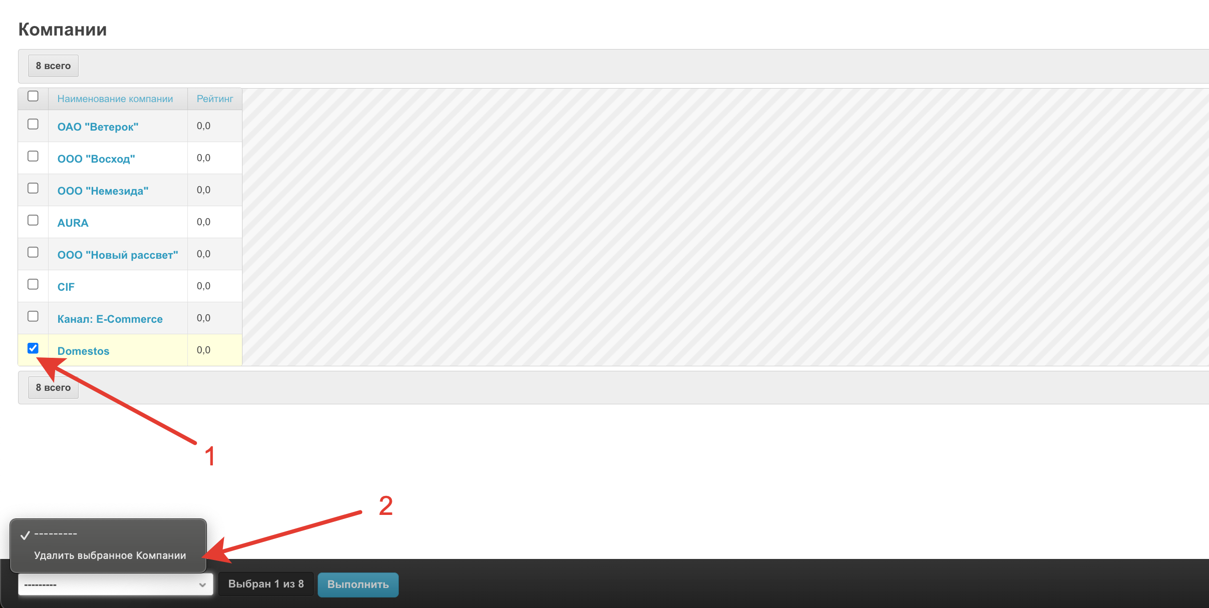 Для удаления компании нужно выделить ее, а далее в меню внизу страницы выбрать Удалить выбранное Компании.