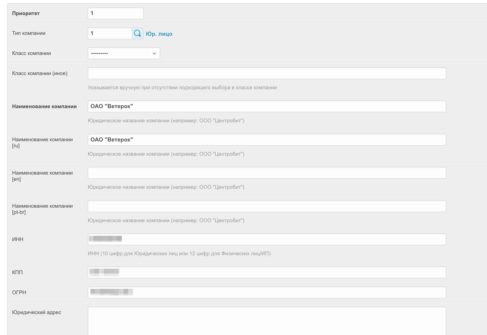 После нажатия на Наименование компании можно перейти в ее карточку. Здесь можно просмотреть и изменить данные по ней.