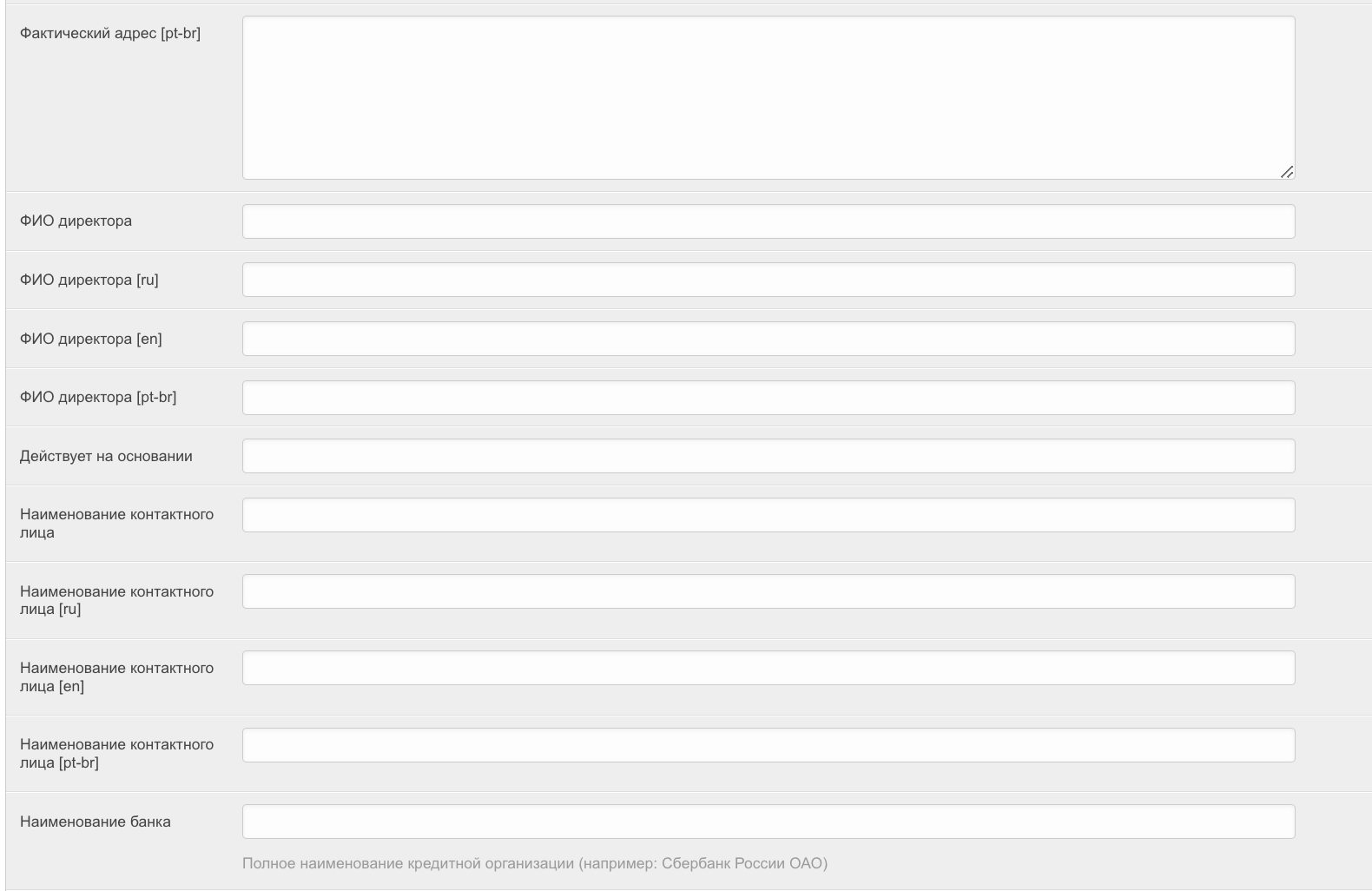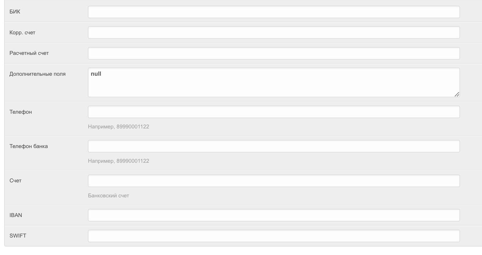 Наименование банка, БИК, Корр. счет, Расчетный счет, Дополнительные поля, Телефон, Телефон банка, Счет, IBAN, SWIFT - платежные данные компании.