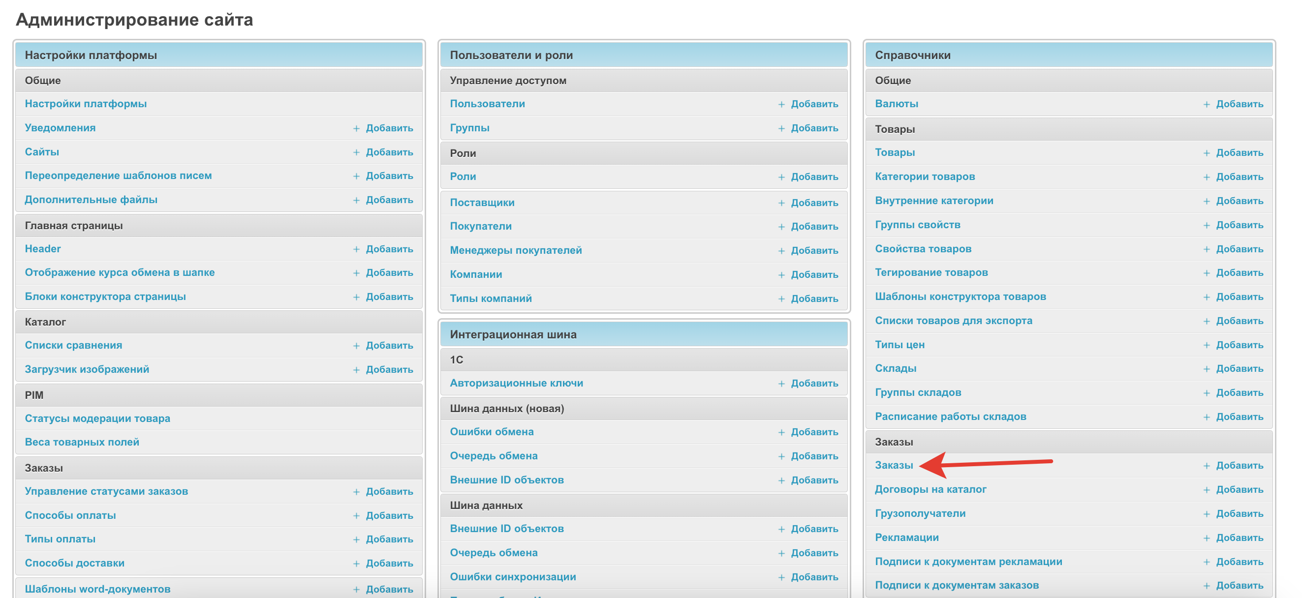 Чтобы открыть данный раздел, в административной панели, расположенной по адресу название_проекта.agora.ru/admin, зайдите в раздел Заказы.