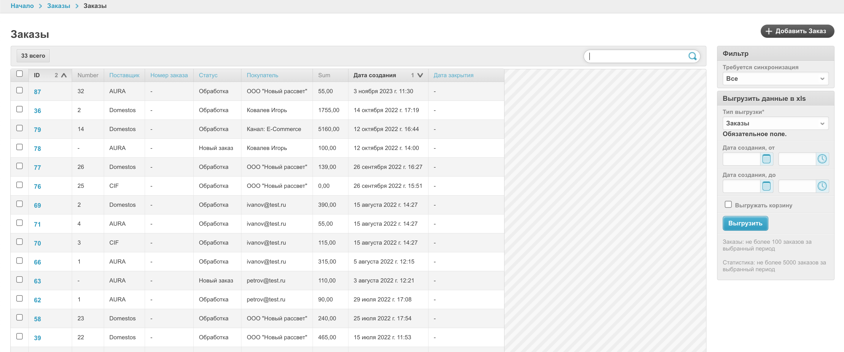Раздел Заказы в административной позволяет просматривать информацию по каждому заказу и вносить изменения (например, вручную переводить статус заказа, синхронизировать с ERP-системой).