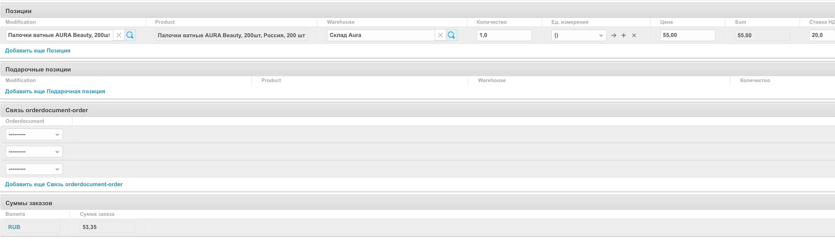 Далее идет отдельный блок Позиции, где дана информация по всем позициям заказа.