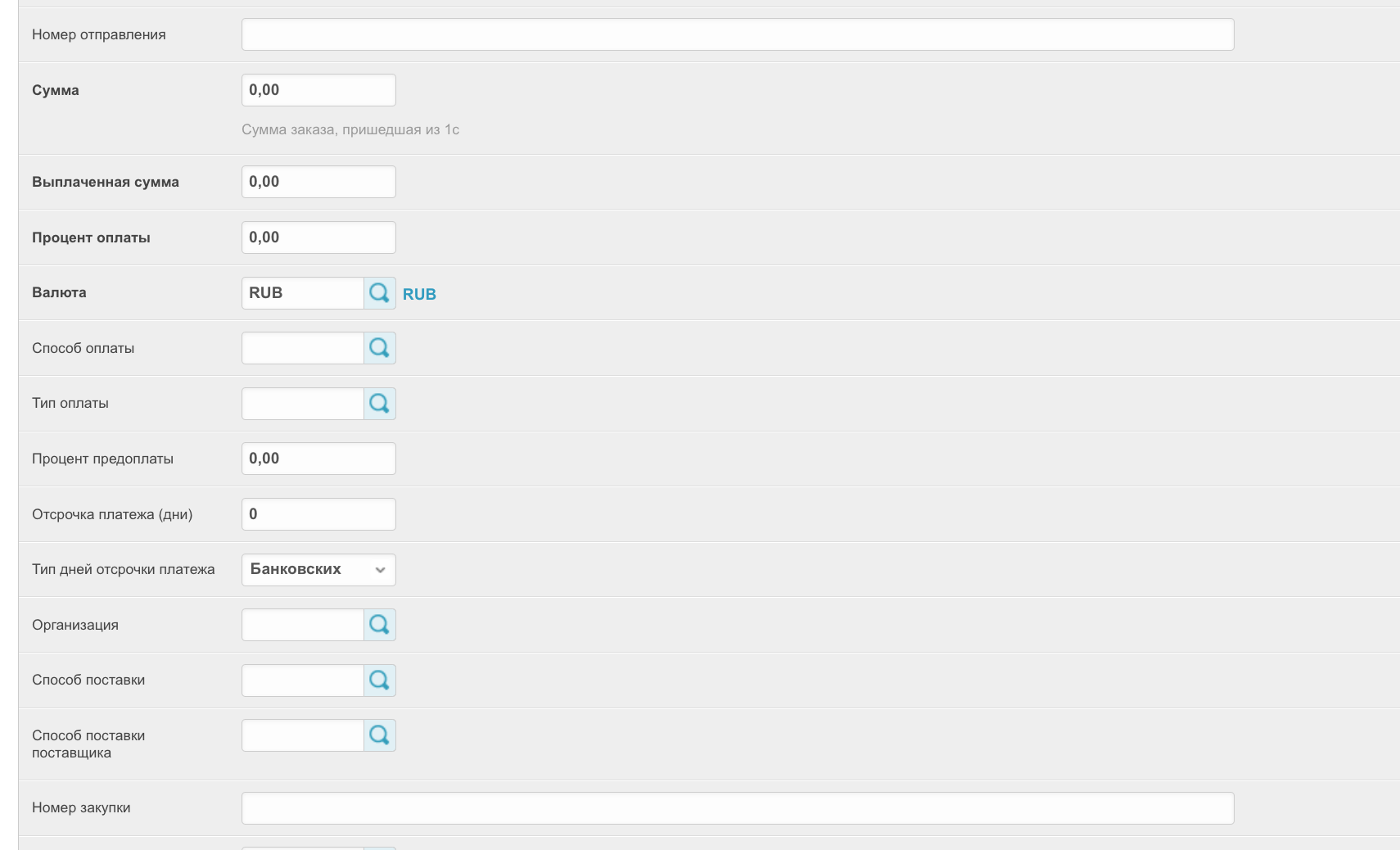 Номер закупки - поле заполняется, если заказ был создан на основании заключенного договора после проведения закупки. Оформление заказа по результату закупки относится к SRM системе.