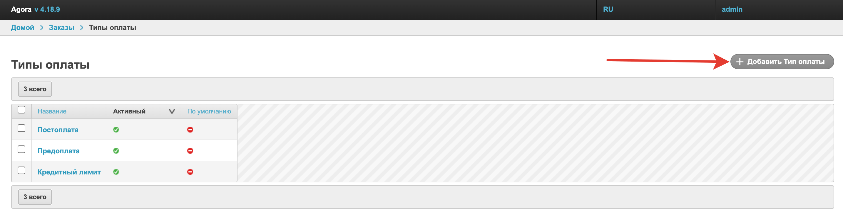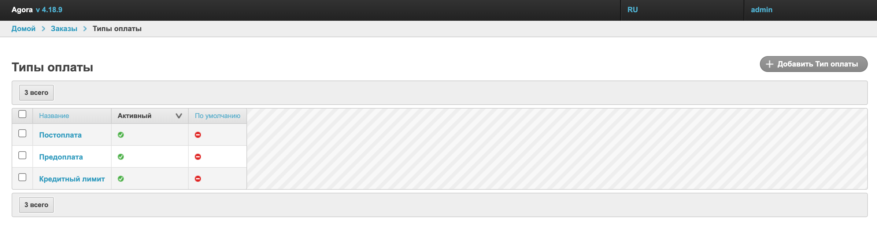 Столбец Активный дает информацию о том, какие типы оплаты на данный момент используются на платформе при оформлении заказа. Столбец По-умолчанию обозначает, какой тип оплаты будет заполняться в корзине по умолчанию.