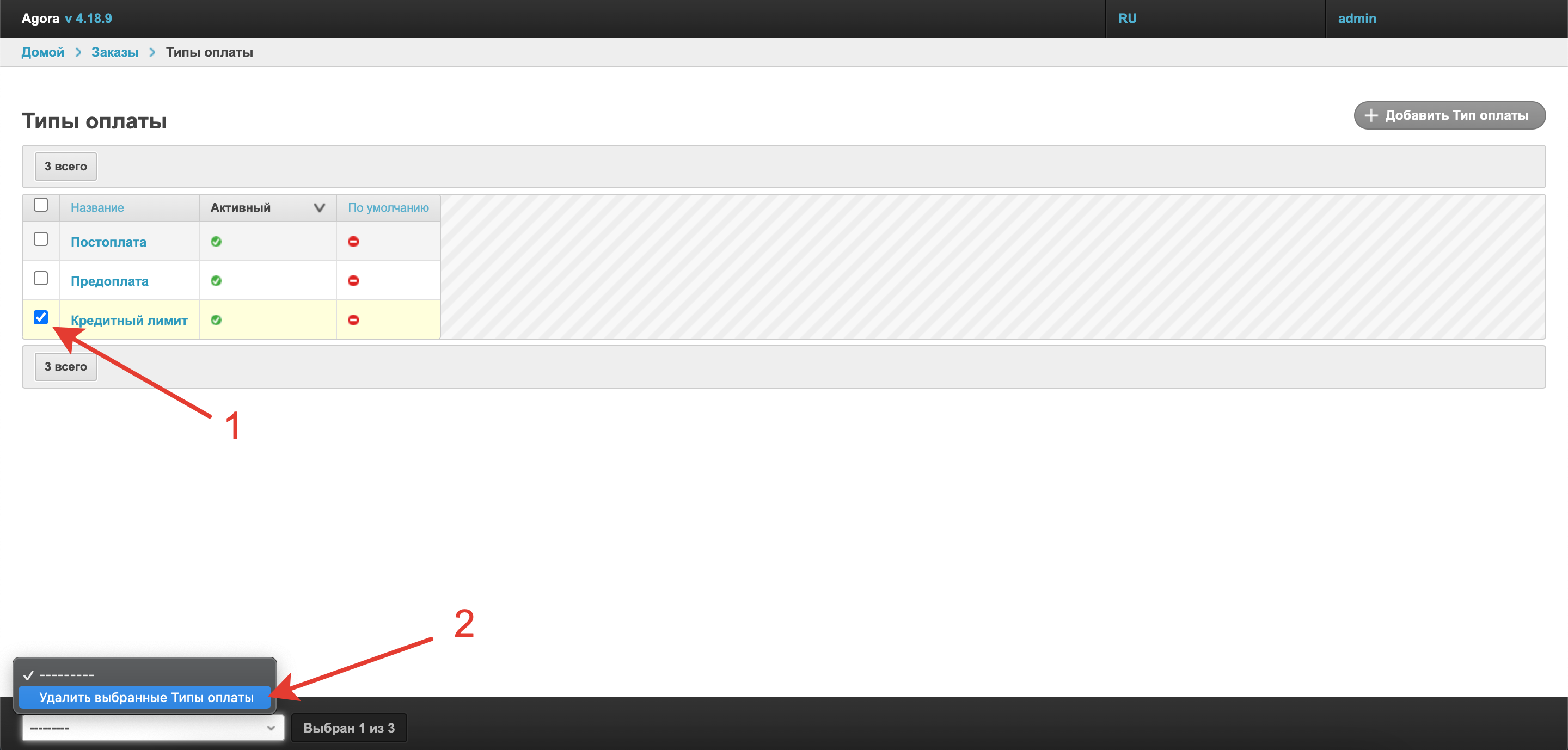Если нужно удалить какой-либо тип оплаты, то достаточно его выделить, а затем слева внизу в раскрывающемся списке выбрать Удалить выбранные Типы оплаты.