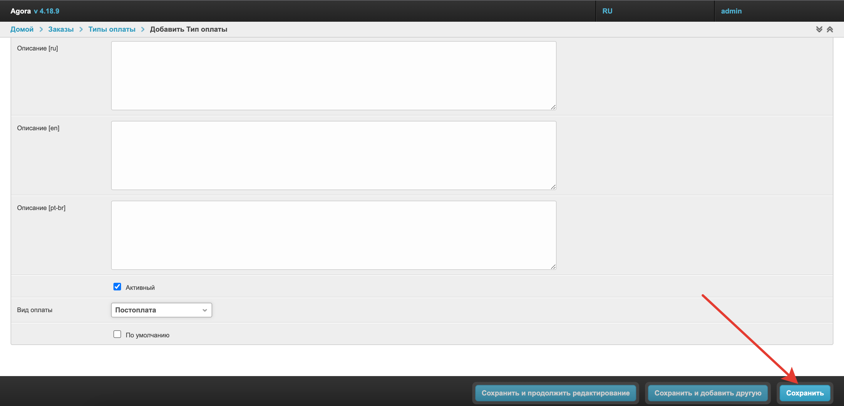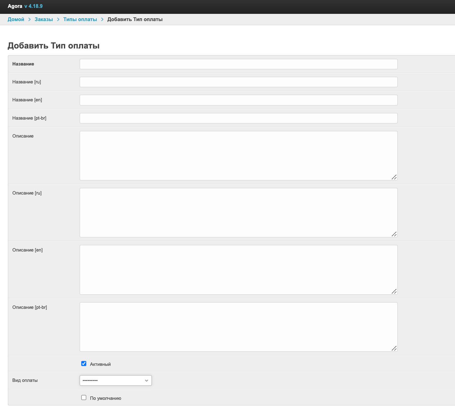 Описание - в этих полях можно указать дополнительные пояснения к этому типу оплаты, которые могут быть полезны администратору платформы. Описание также может быть указано на разных языках.