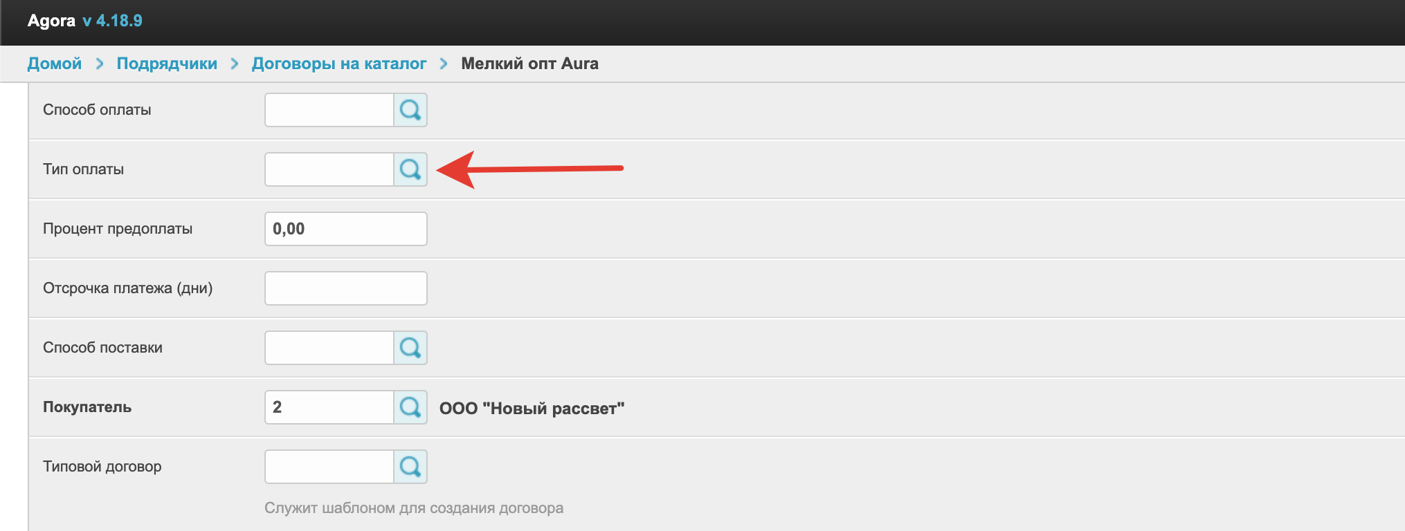 Кроме того, тип оплаты может быть указан в договоре покупателя. В этом случае у покупателя в корзине не будет отображаться поле для выбора и при оформлении заказа по выбранному договору тип оплаты будет заполняться из этого договора.