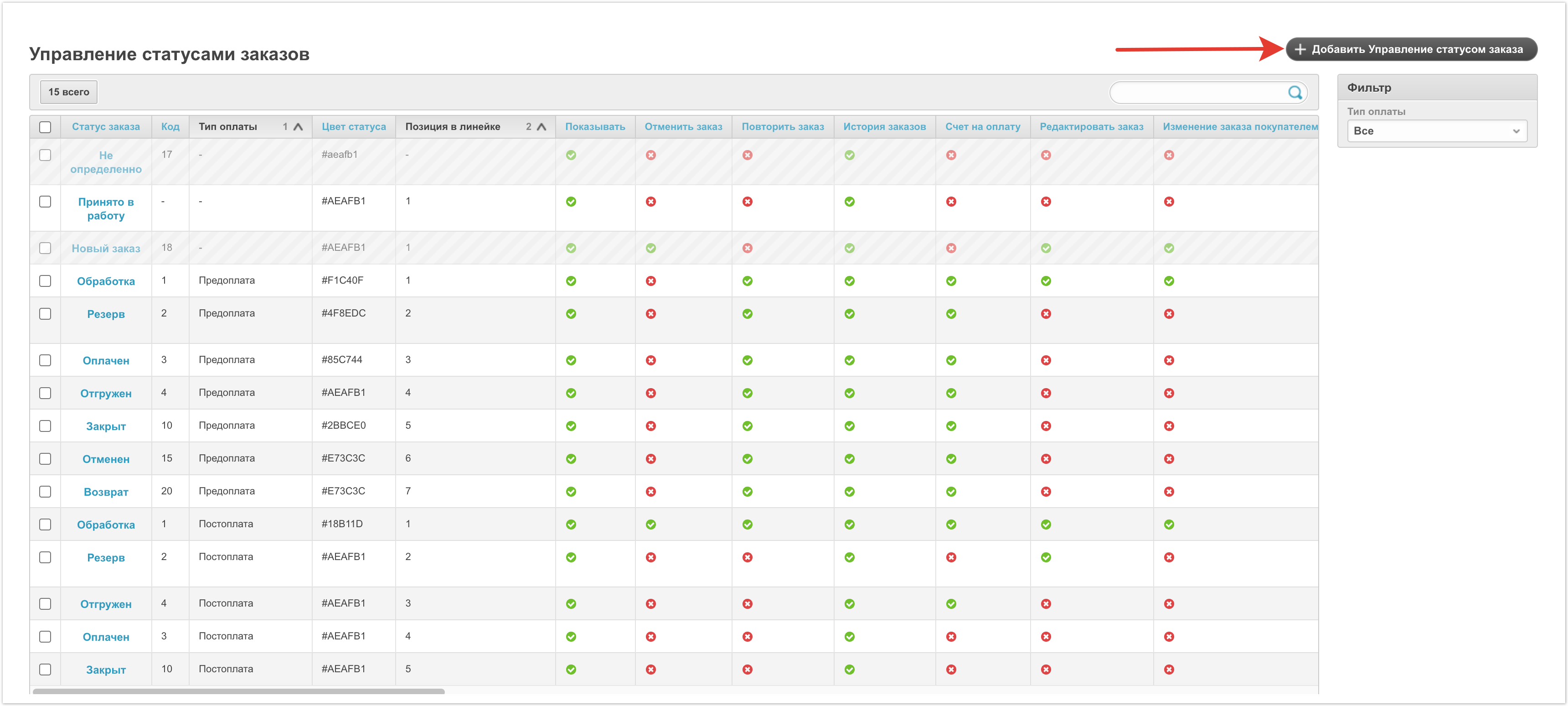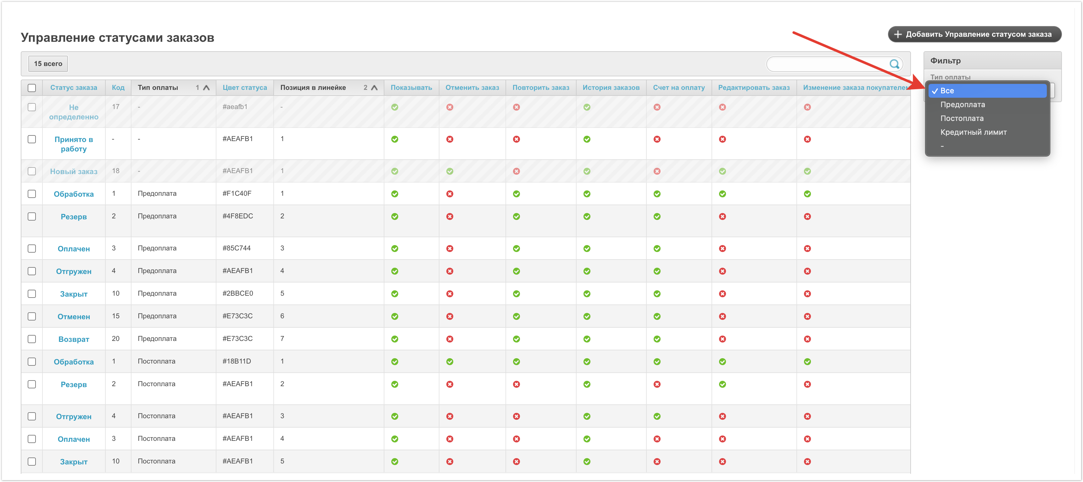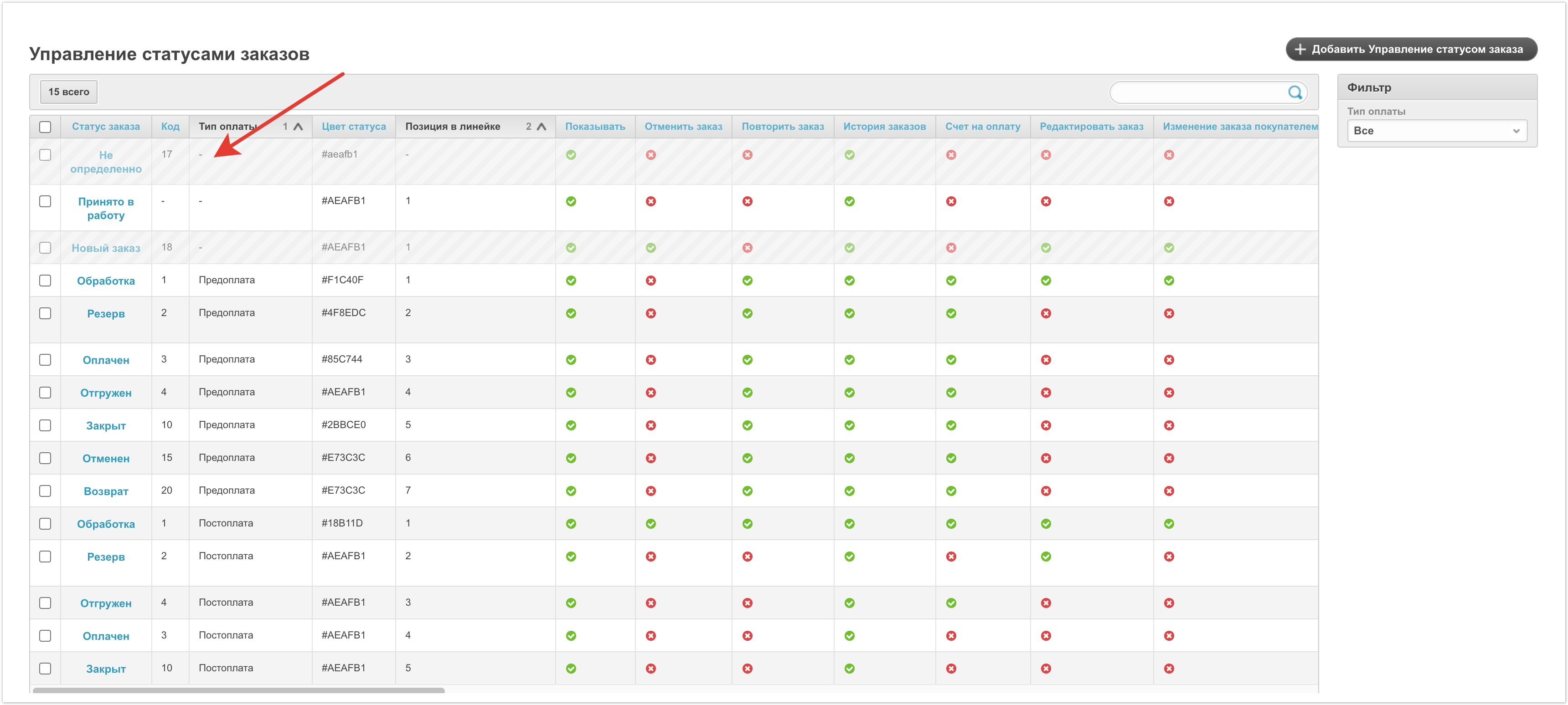 Кроме того, на странице доступна фильтрация. Фильтровать данные можно по типу оплаты. Фильтрация будет полезна, если используется несколько линеек статусов и нужно просмотреть статусы только в конкретной линейке.