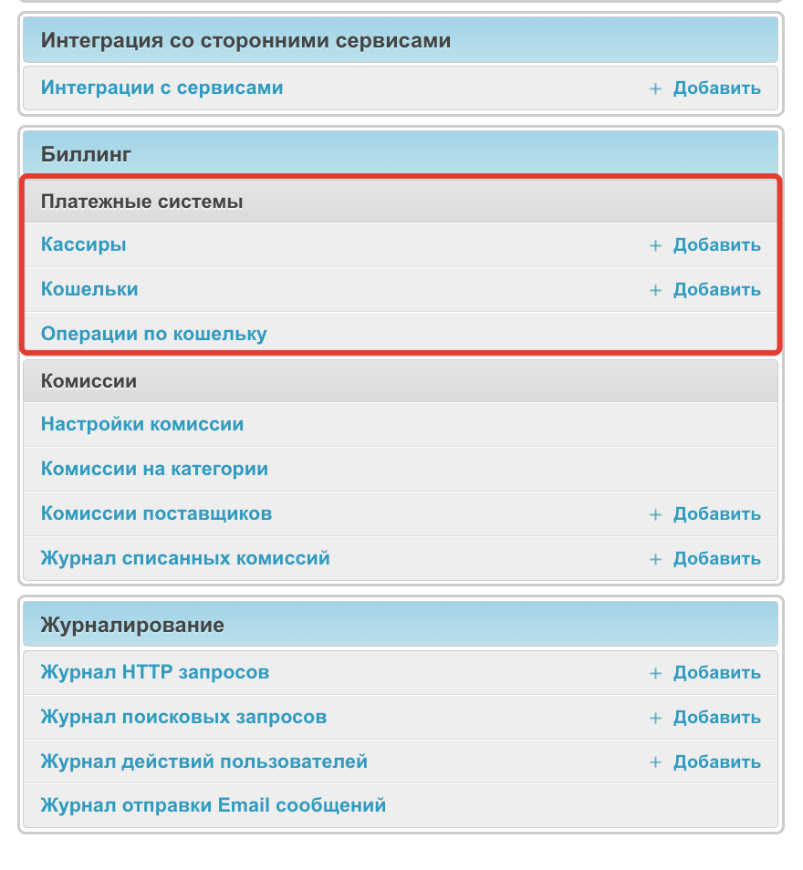 В разделе Кошельки хранится информация по кошелькам пользователей.