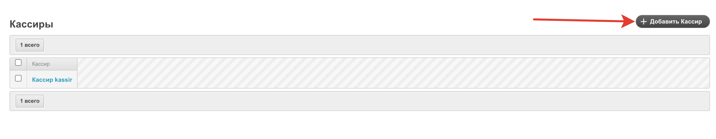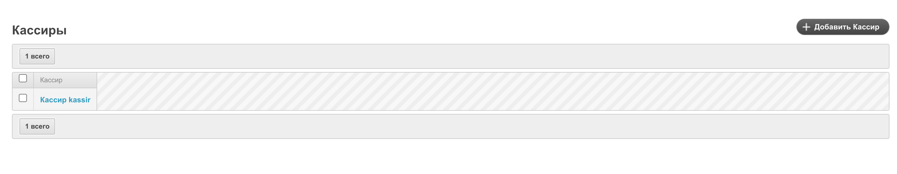 По кнопке Добавить Кассир можно выполнить добавление нового кассира. Предварительно нужно завести нового пользователя для кассира через раздел Пользователи.