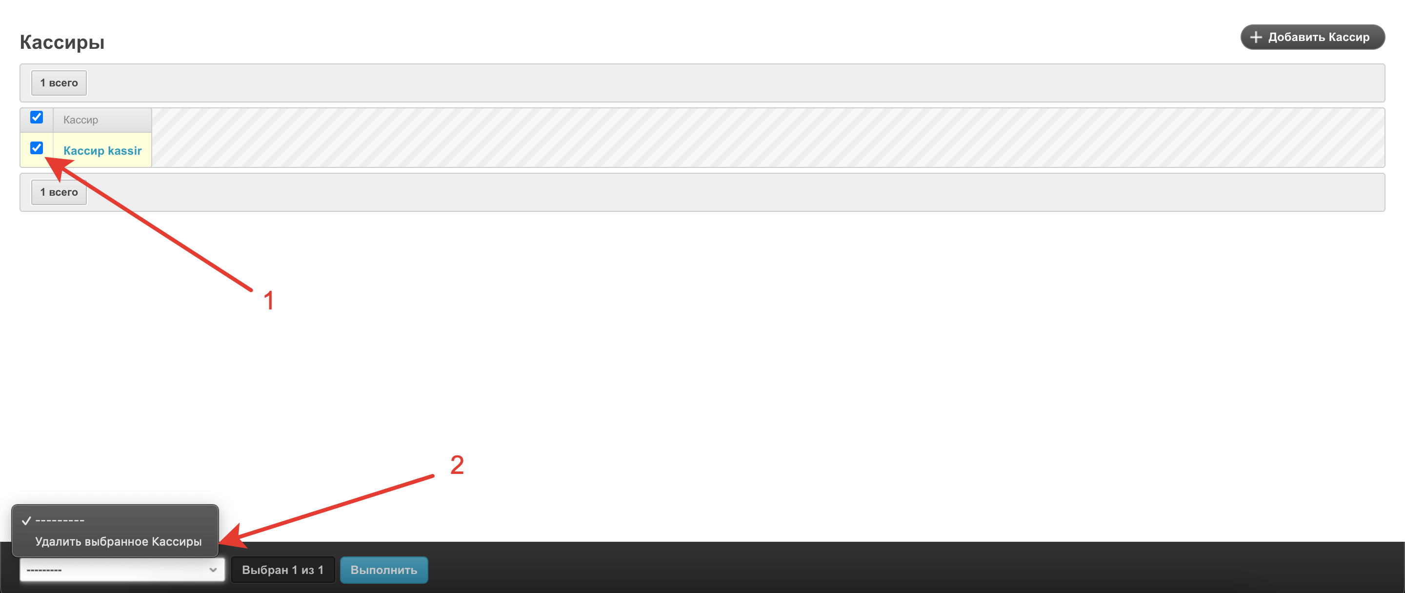 Для удаления заведенных ранее кассиров нужно их выбрать, а далее в меню внизу страницы выбрать Удалить выбранное Кассиры.